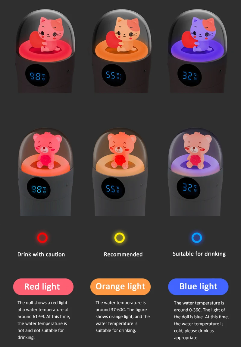 2. Кукла показывает красный светильник при температуре воды 61-99. Температура воды в это время является горячей и не подходит для питья. Температура воды составляет около 37-60 ℃. Кукла показывает оранжевый светильник, а температура воды подходит для питья. Температура воды составляет около 0-36 ℃. Светильник куклы синего цвета. В это время температура воды холодная, пожалуйста, выпейте по мере необходимости.