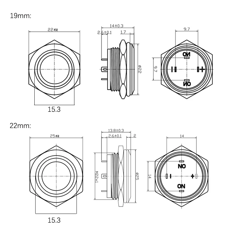"+": Положительный полюс светодиода " - ": Отрицательный полюс светодиода «Нет»: Обычный открытый "C": общий Подключение «NO» и «C»: схема доступна только при нажатии кнопки.