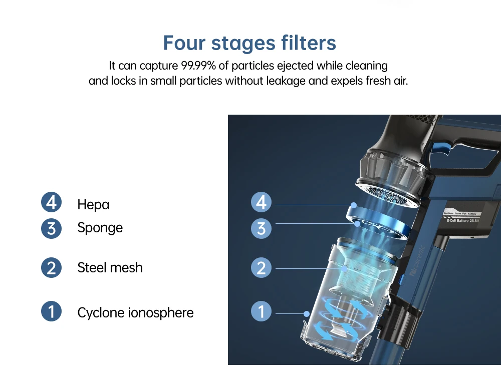 Эти четыре этапа фильтра (HEPA, губка, стальная сетка и циклон ионосферы) могут помочь удалить мелкие частицы пыли, позволяя вам наслаждаться свежим и более здоровым воздухом