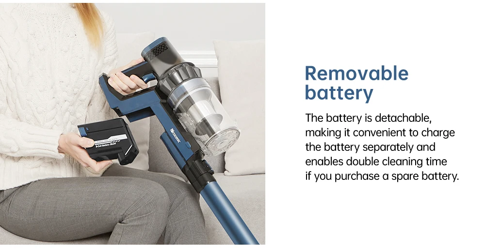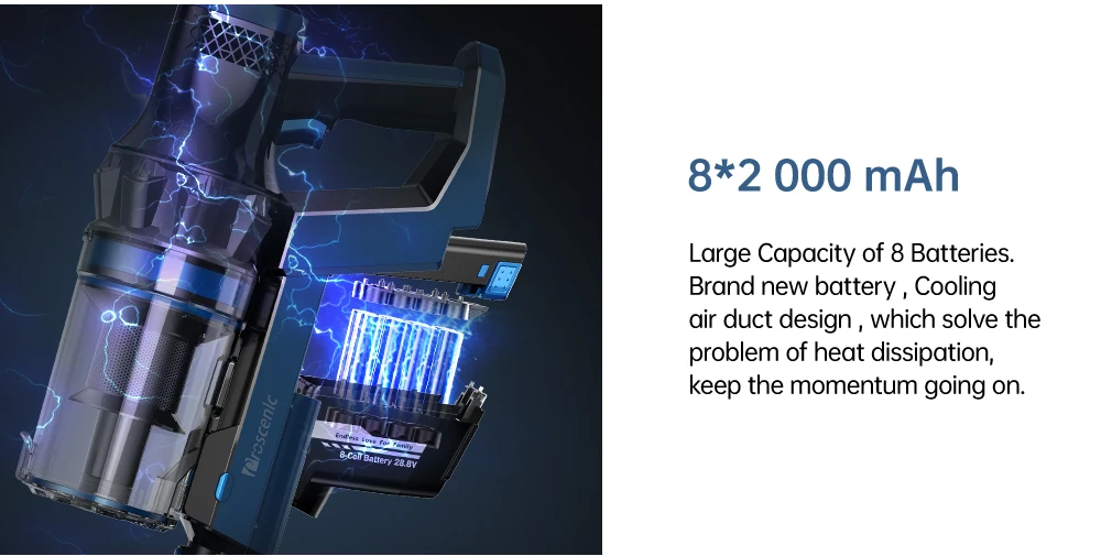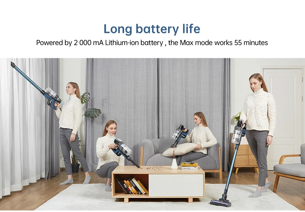 С литиевой батареей 2000 мАч * 8, время работы до 52 ± 3 минут во время эко-режима, съемная конструкция позволяет использовать с другим запасным аккумулятором.