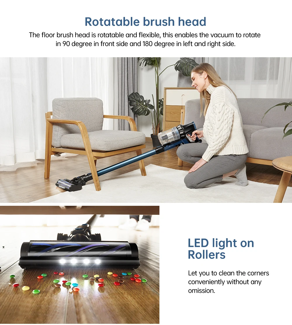 1. Напольное сопло с светодиодный передний светильник ---- светодиодный передний светильник помогает определить и удалить грязь даже в труднодоступных местах (например, под диван). С вращающейся насадкой для пола вы можете достичь даже труднодоступных мест.