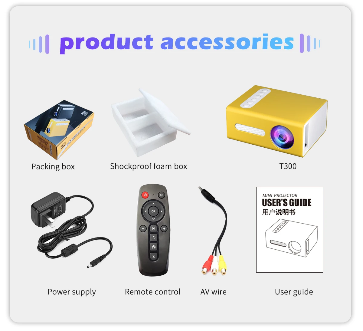 Посылка: ЖК-проектор T300-1 шт., пульт дистанционного управления-1 шт., av-кабель-1 шт., руководство пользователя на английском языке-1 шт.