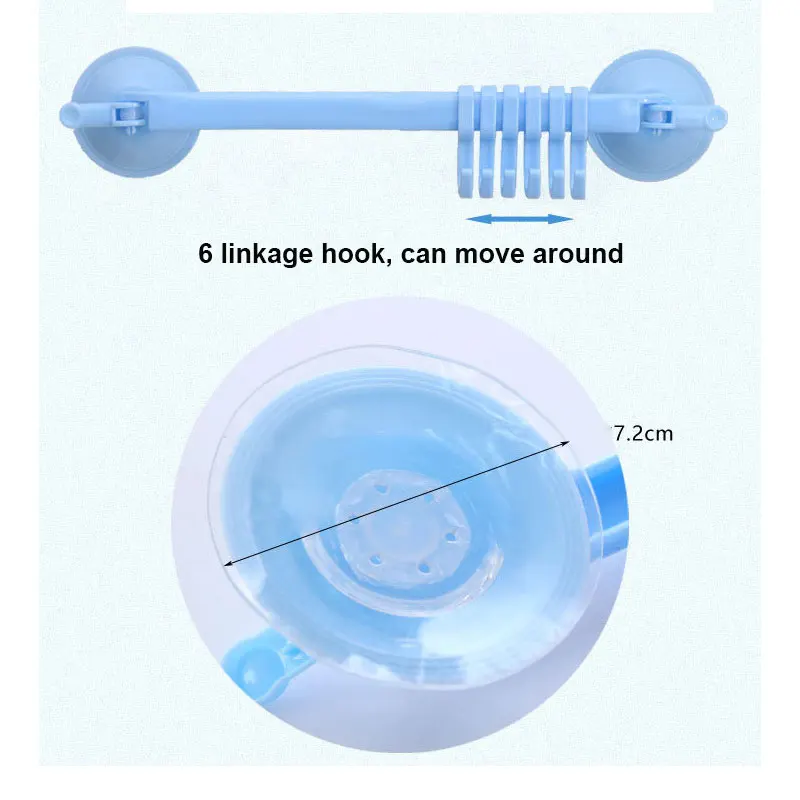 *PP hook, sturdy and durable; PVC adhesive, strong adsorption; large-capacity storage, with 6 movable hooks, installed on walls, corners, etc., can hang towels, bath balls, etc.