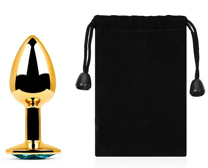 Золотая анальная пробка из алюминия размер S. Страз в основании круглой формы, выполнен из стекла светло-фиолетового цвета. Упакована в вельветовый мешочек для хранения.