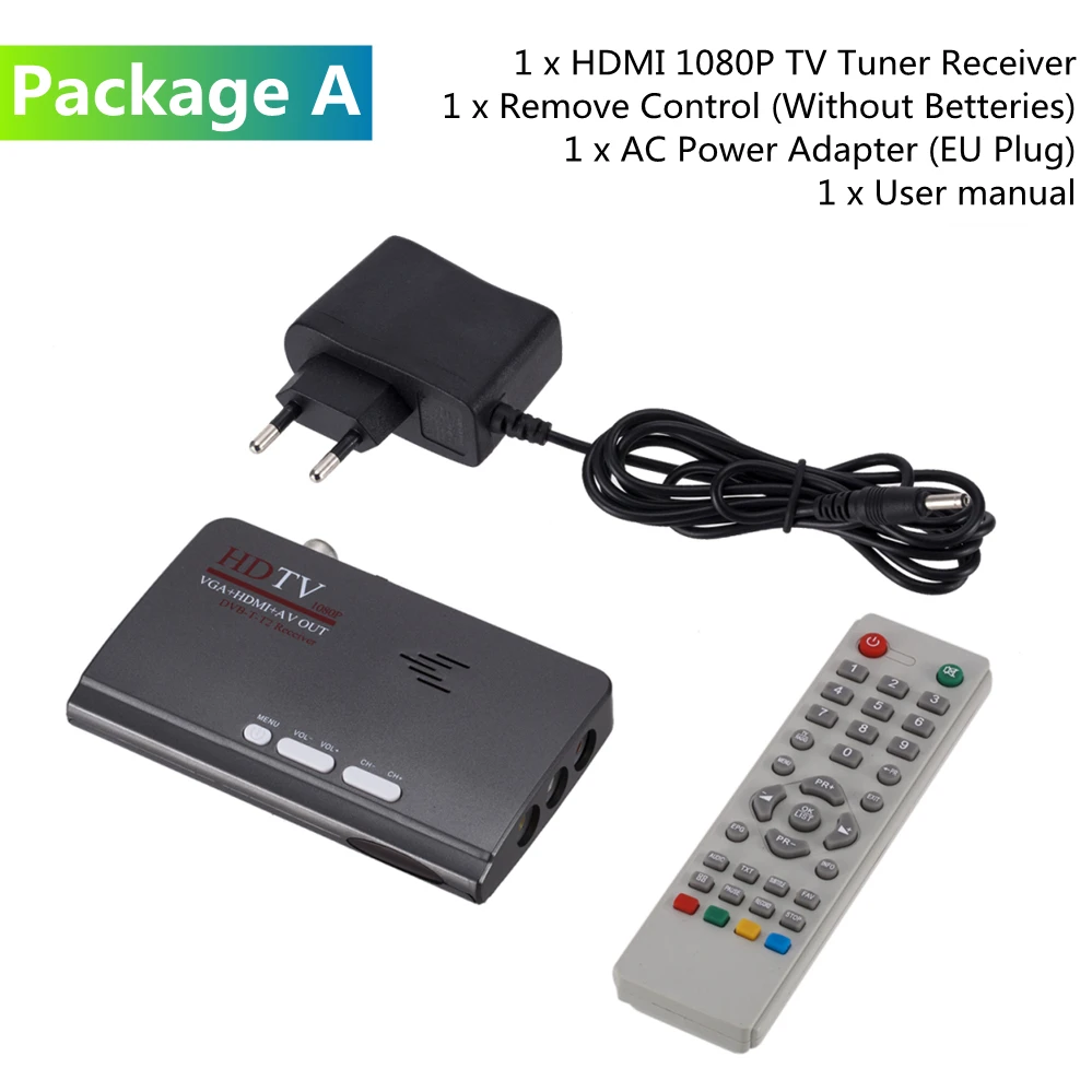 1 x HDMI 1080P ТВ-тюнер приемник 1 x управление удалением (без аккумулятора) 1 х адаптер питания переменного тока (штепсельная Вилка EU/US/UK) 1 x Руководство пользователя Розничная коробка не будет включена, но мы упакуем ее перед отправкой.
