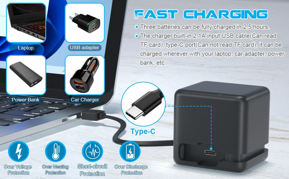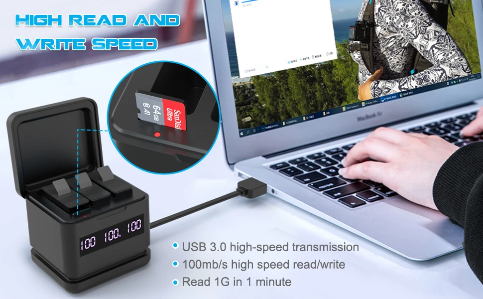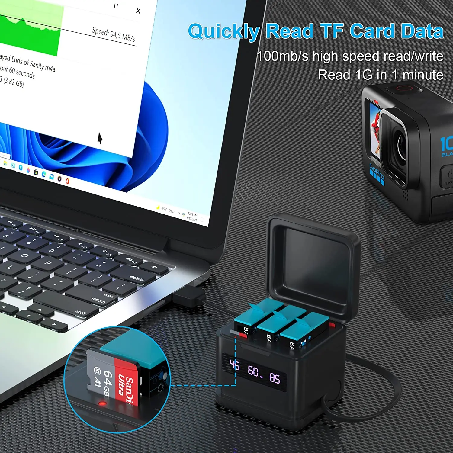 Зарядное устройство может хранить 3 micro SD карты и читать 1 micro SD карты. Зарядное устройство разработано с 1 слотом для tf-карты, 100 МБ/с./с для чтения/записи данных на высокой скорости и 2 дополнительными слотами для хранения TF. Встроенный usb-кабель зарядного устройства также имеет порт type-C, поэтому вам не придется доставлять дополнительные линии во время путешествий. Три батарейки займет всего 2,5 часов для полной зарядки (пожалуйста, чтобы использовать 5V2A или более мощное зарядное устройство).