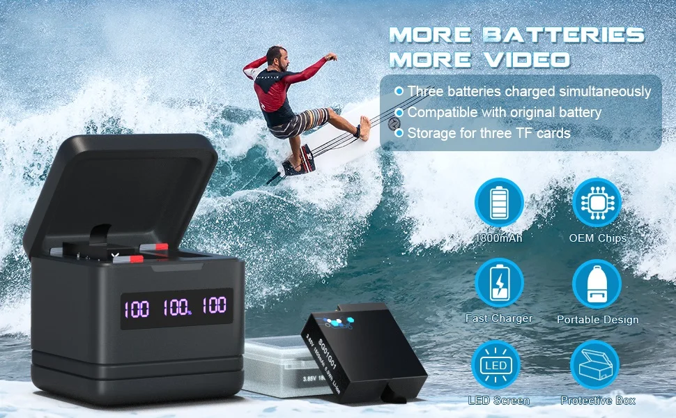 Аккумулятор использует новый полностью декодированный чип, никогда не повредит камеру. Аккумуляторы и зарядное устройство полностью совместимы с Gopro hero 10 9 8 7 6 5, работает так же, как и официальные. Большая емкость длится дольше, чем время официального использования.