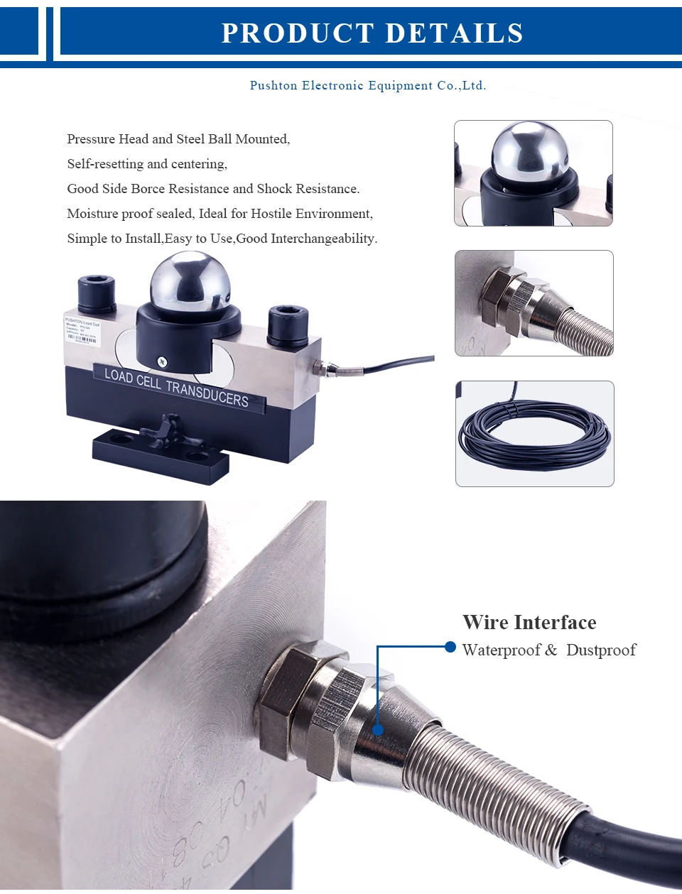 Конструкция взвешивания, напорная головка и стальной шарик, самонастройка и центрирование, хорошая боковая стойкость и ударопрочность. Влагонепроницаемые герметичные, адаптируются к плохим условиям работы, просты в установке, просты в использовании, хорошая взаимозаменяемость, подходят для электронных грузовых автомобилей, железнодорожных шкал, шкал хоппера и различных специальных весов.