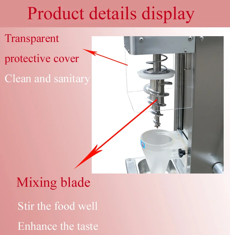 1. Любой, кто заказывает, получит пластиковую чашку бесплатно 2. Эта машина имеет функцию молочного коктейля 3. Машина имеет светодиодный свет и выглядит очень красиво 4. Эта машина может быть оснащена утолщенной чашкой из нержавеющей стали, которая является более прочной. 5. Функция самоочистки машины 6. Реализуем идеальное сочетание мороженого с фруктами, орехами и молочными коктейлями, разнообразным натуральным фруктовым ароматизированным мороженым. 7. С помощью ручного управления, удобно сжимать фрукты и регулировать скорость. 8. Струйная очистка может эффективно решить проблемы различных фруктов и специфических запахов при производстве мороженого.