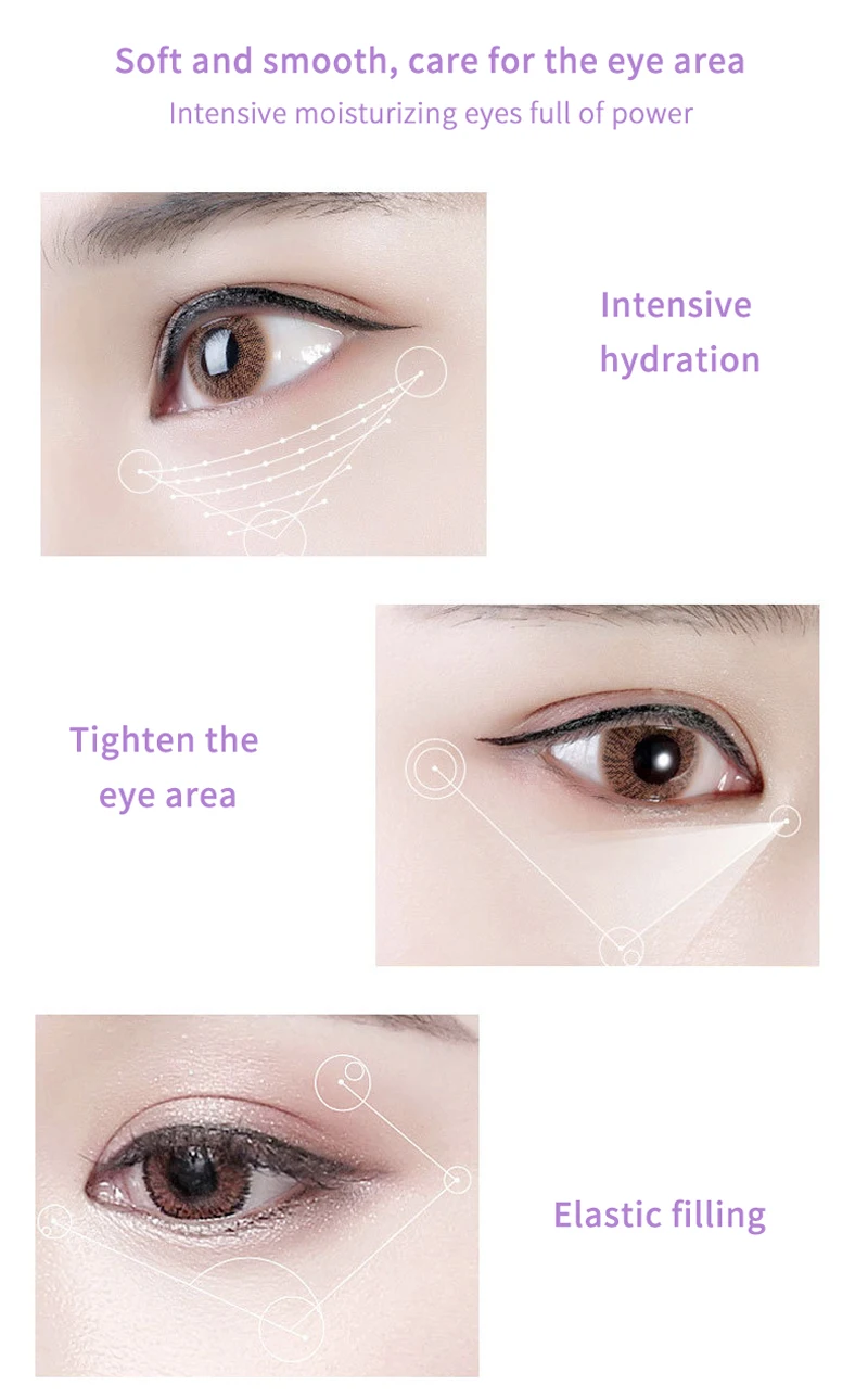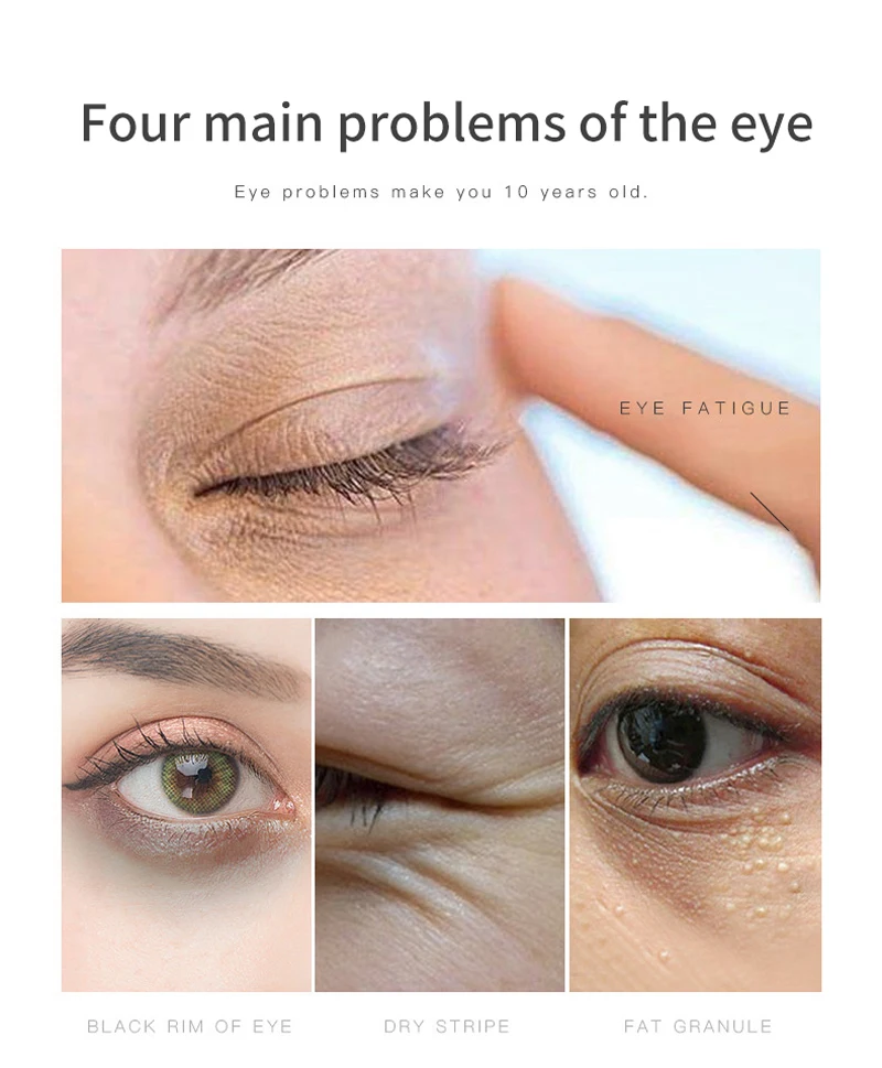 Эффективность продукта: решение проблем с кожей вокруг глаз, таких как отечность под глазами, темные круги и т. Д., снятие морщин, сухих линий и гусиных лапок вокруг глаз, Повышение эластичности и упругости кожи.