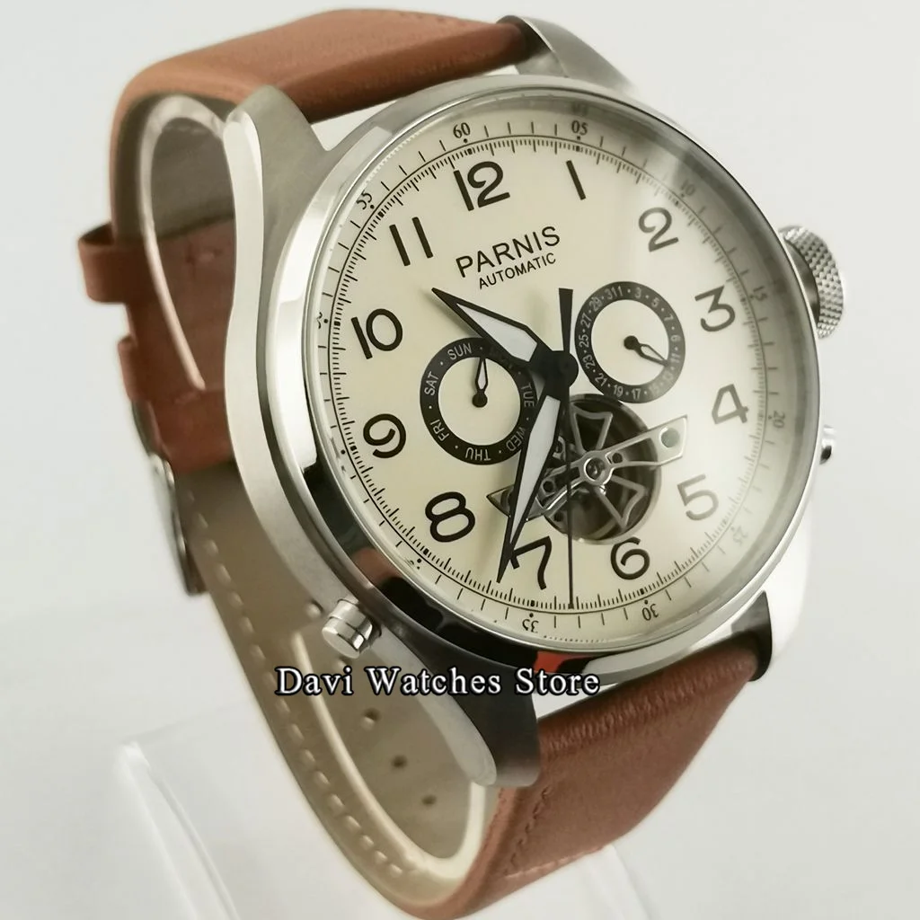 Parnis 48 мм топ автоматические мужские часы механический коричневый ремешок Календарь Неделя дисплей мужские часы relojes para hombre