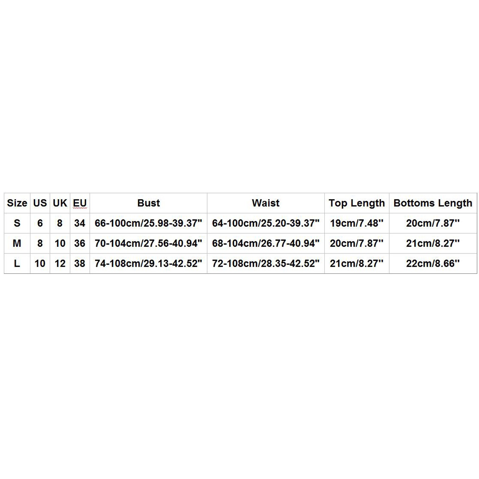 Размер США Великобритания ЕС Бюст Талия Длина верха Длина нижней части S 6 8 34 66-100 см/25,98-39,37" 64-100 см/25,20-39,37" 19 см/7,48'' 20 см/7,87'' М 8 10 36 70-104 см/27,56-40,94" 68-104 см/26,77-40,94" 20 см/7,87'' 21 см/8,27'' L 10 12 38 74-108 см/29,13-42,52" 72-108 см/28,35-42,52" 21 см/8,27'' 22 см/8,66''