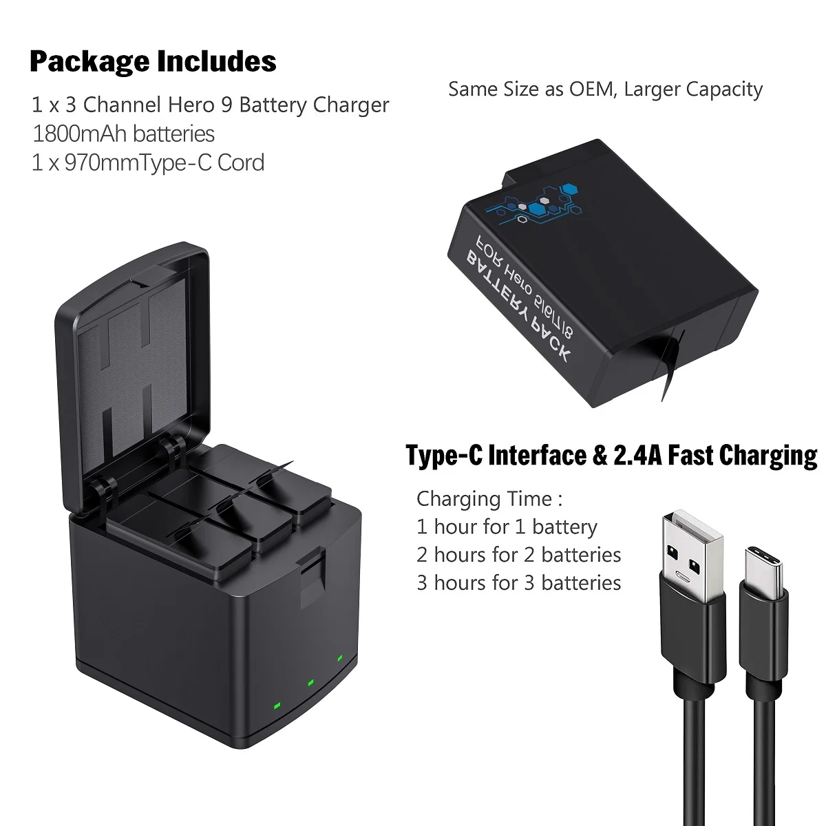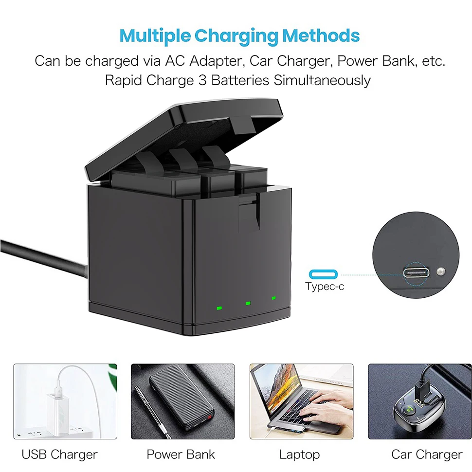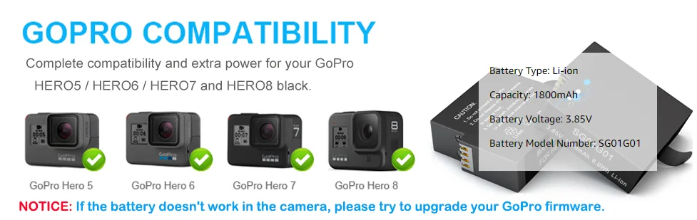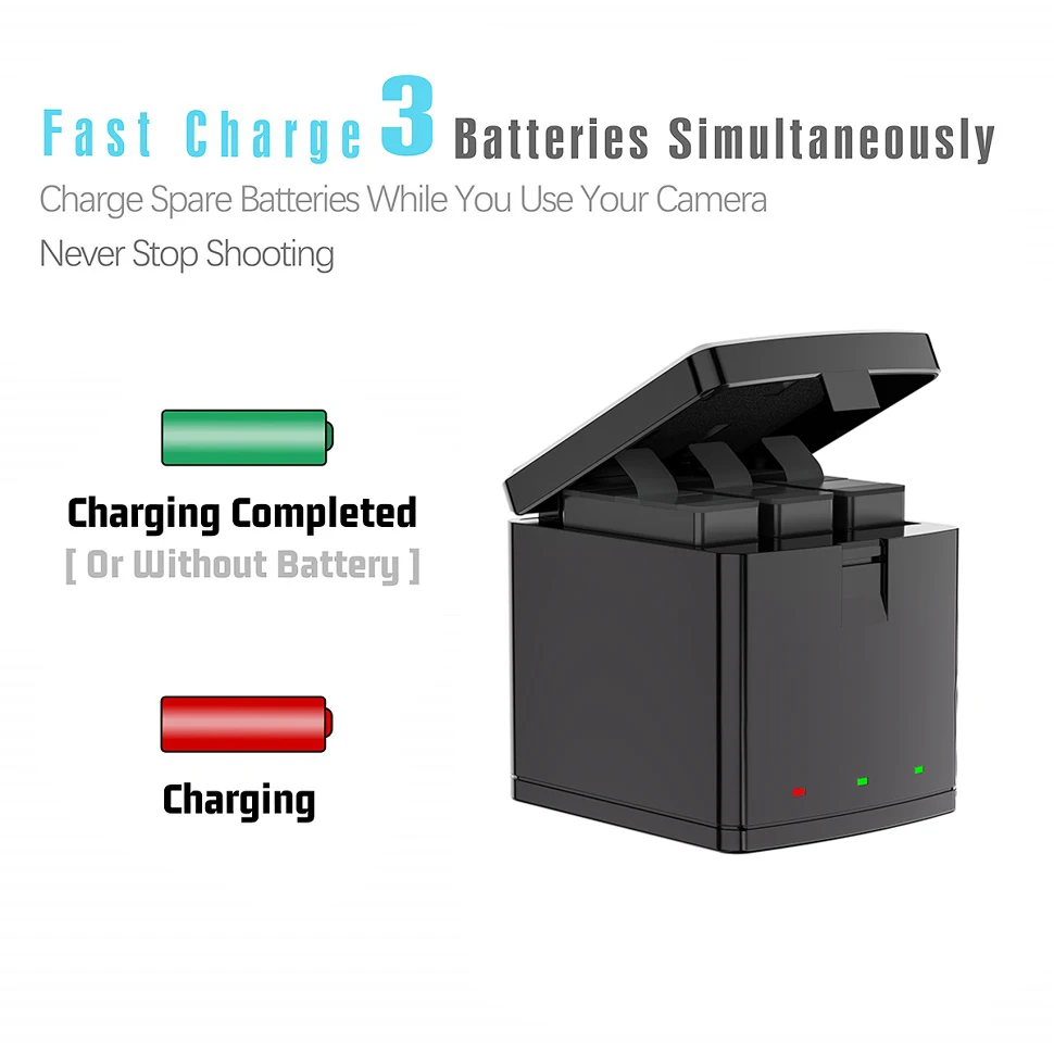 【Полностью совместим с Original】: перезаряжаемая батарея и тройное более быстрое зарядное устройство совместимы с GoPro Hero 8 Black, Hero 7 Black, Hero 6 Black, Hero 5 Black, AABAT-001, AJBAT-001 camera. Примечание: Если аккумулятор не работает в камере, попробуйте обновить прошивку GoPro.