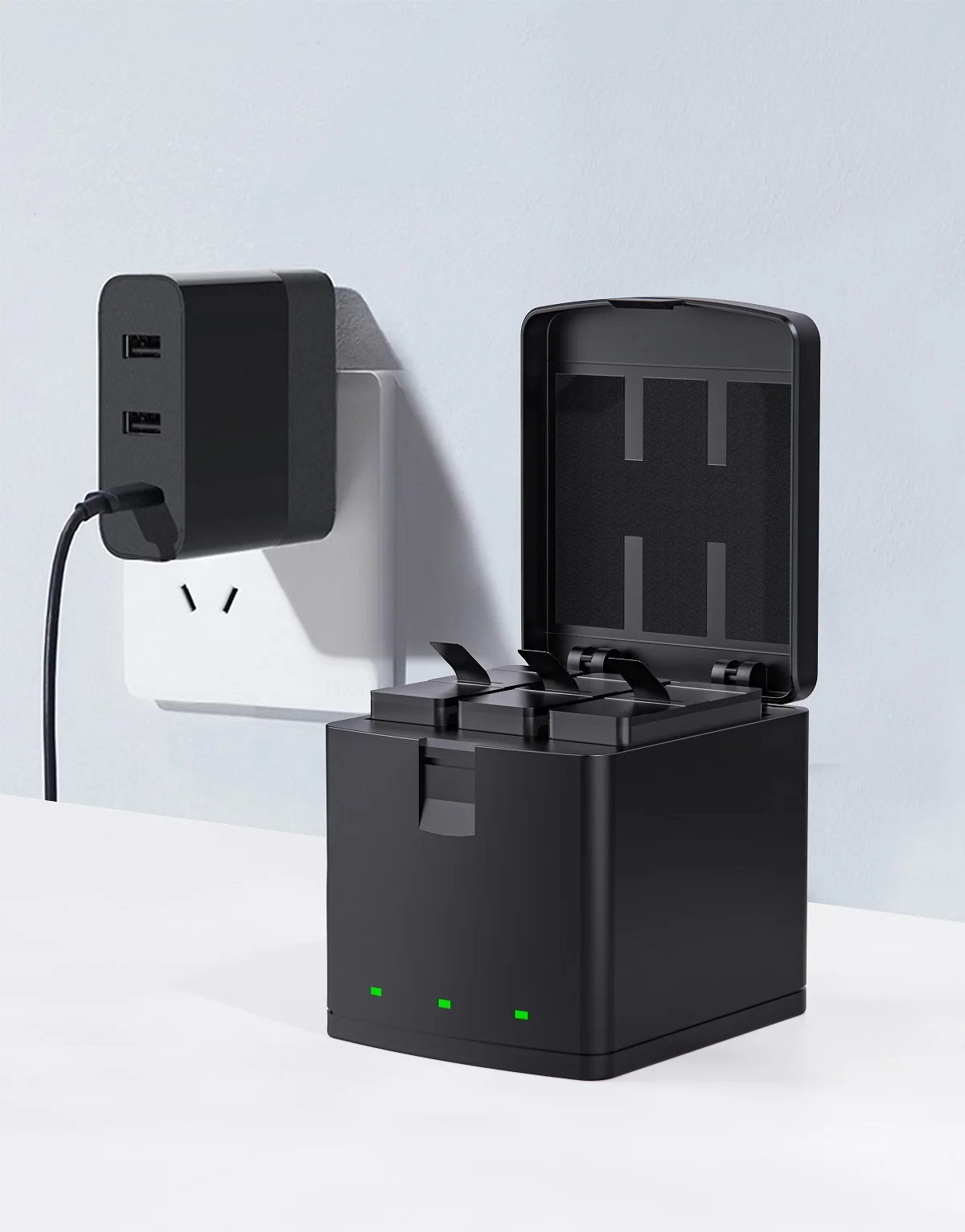 【Интеллектуальное тройное Зарядное устройство: цифровой экран отображает состояние зарядки трех батарей одновременно и может отображать определенный процент электроэнергии. Позволяет использовать камеру при зарядке запасного аккумулятора.