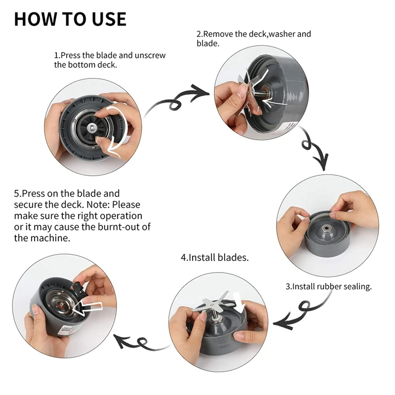 [Простая установка]-Сначала установите Силиконовое кольцо, поверните чашку, чтобы закрепить прокладку, затем установите лезвие, наконец нажмите на лезвие и закрепите колодку снизу. Пожалуйста, обратите внимание, что вы должны использовать осторожно и не нажимать на край лезвия при обращении с лезвием. Никогда не храните лезвие в основании, если не прикреплено к контейнеру для смешивания.
