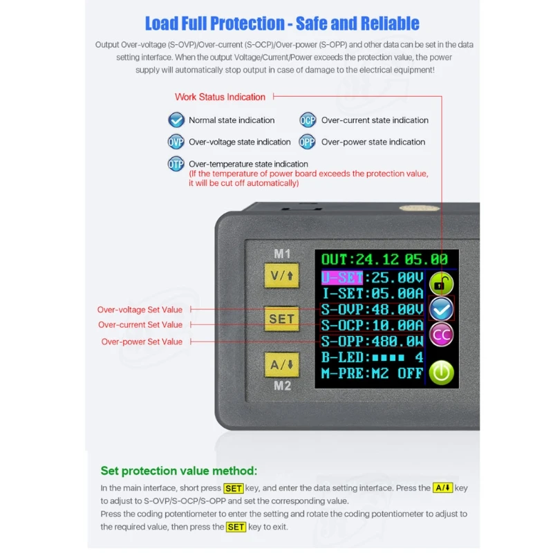Интеллектуальное вычисление выходного напряжения и тока в мощности и отображение значения на большом экране; автоматическая переноска с десятичной запятой и светодиодный дисплей с 4 цифрами дисплеев функции напряжения. Ток и порох; Клавиатура может быть заблокирована для предотвращения неправильной работы.
