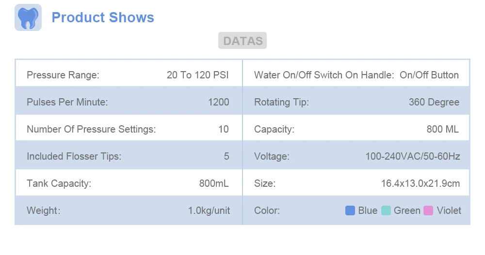 Водный Флоссер V300 удерживает зубной налет и мусор между зубами и ниже жевательной линии. 10 настроек давления воды позволяют настроить бережное и глубокое очищение. 5 уникальных насадок очищают специализированными способами, в то время как вместительный резервуар объемом 800 мл уменьшает потребность в заправках.