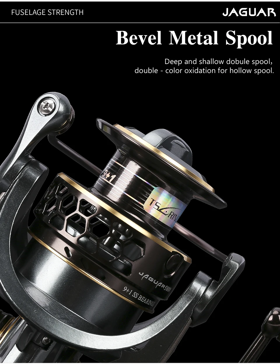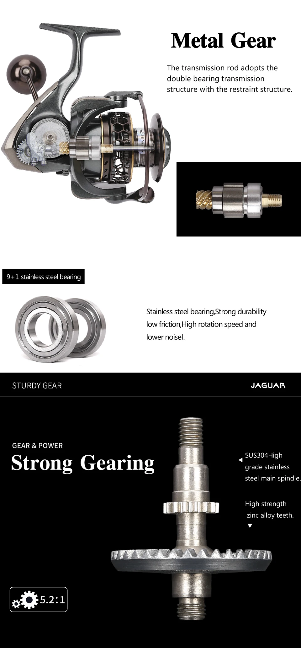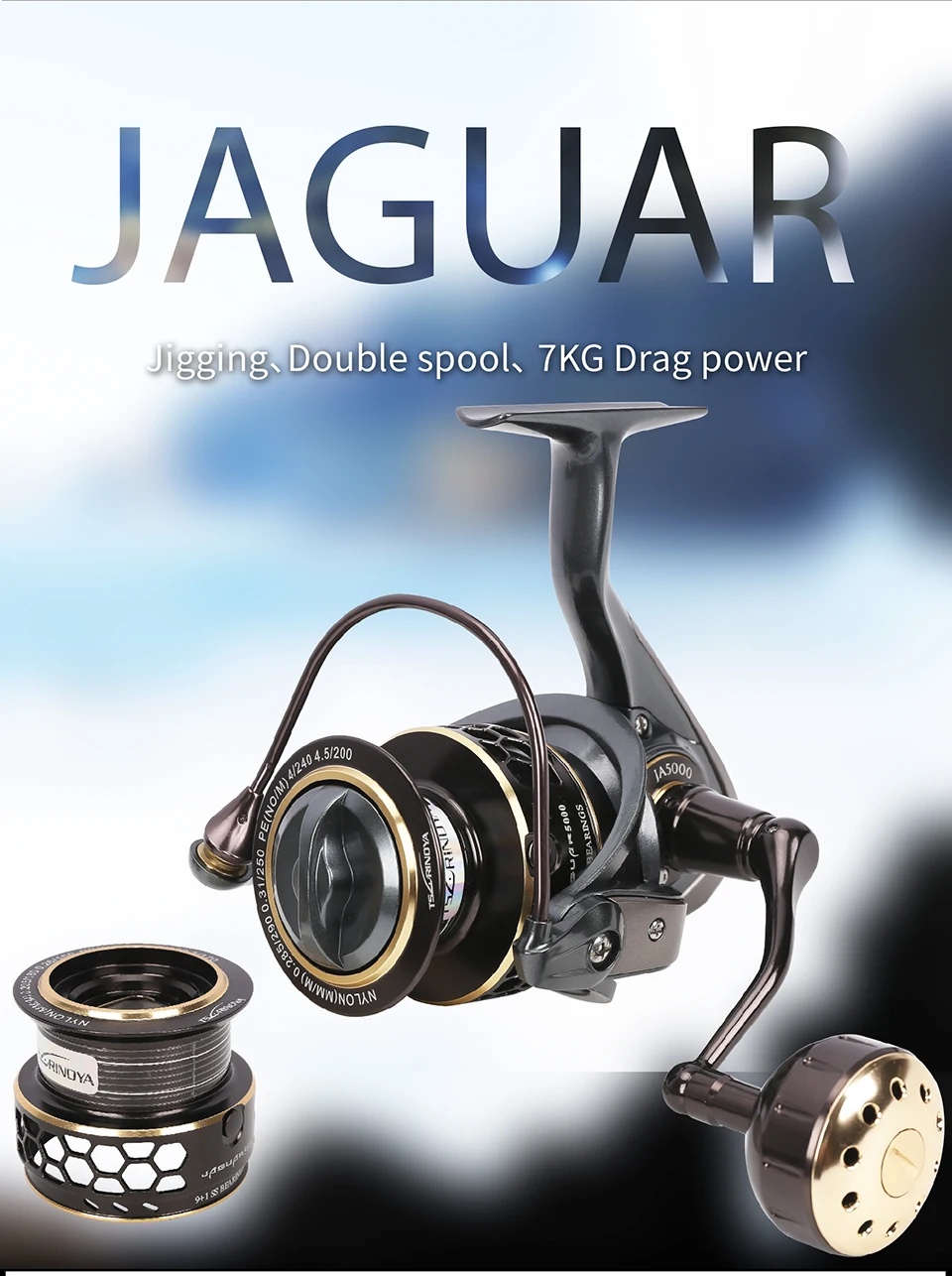2. JAGUAR5000 | Вес: 332 г | Передаточное отношение: 5,2: 1 | Подшипник: 9 + 1BB | Максимальное сопротивление: 7 кг | Линейная Емкость (мм-М): глубокий 0,32/240,0.38/160 мелкий 0,26/200,0.28/170