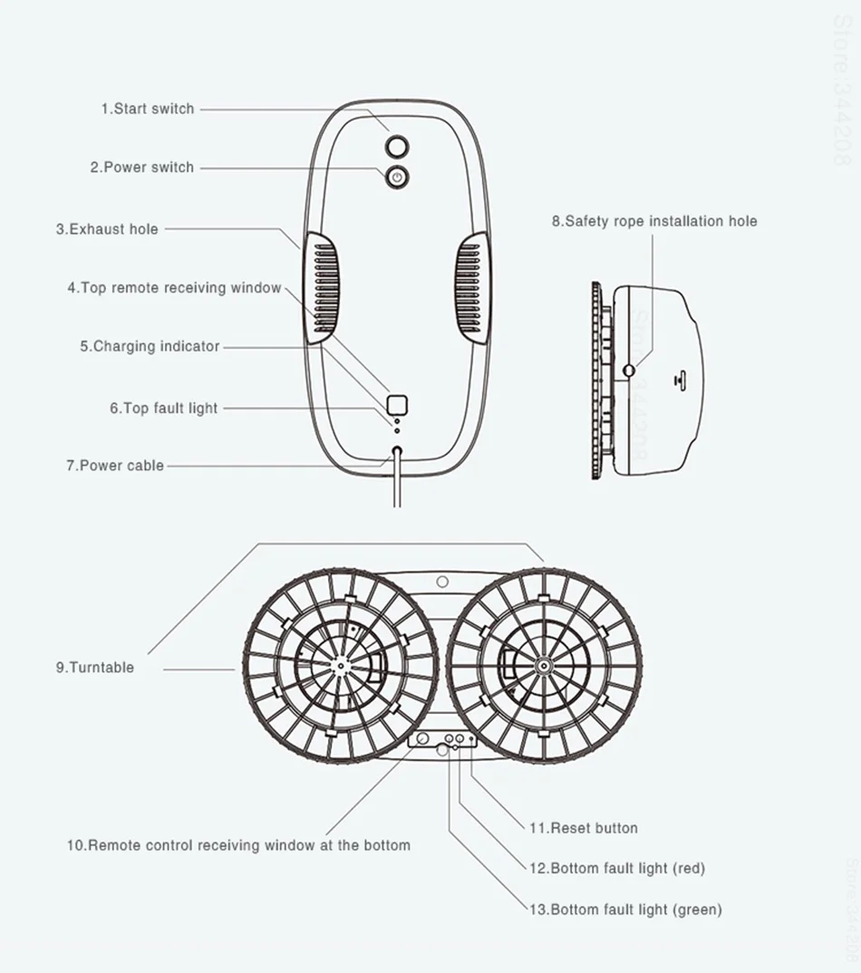 1. Переключатель запуска2. Выключатель питания3. Выпускное отверстие4. Верхнее удаленное приемное окно5. Индикатор зарядки6. Верхний светильник неисправности7. Кабель питания8. Отверстие для установки защитной веревки9. Поворотный стол10. Пульт дистанционного управления приемное окно в нижней части11. Кнопка сброса12. Нижний светильник неисправности (красный)13. Нижний светильник неисправности (зеленый)![]()