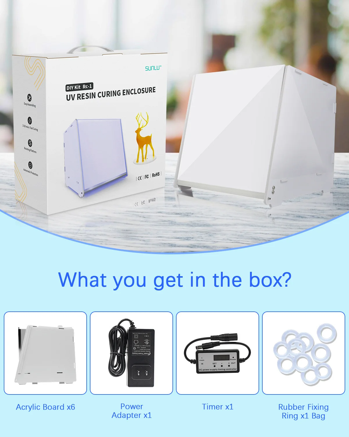 По сравнению с другими УФ-светильник, лампа, наш светильник, отверждения коробки, светильник er в весе. Для сборки требуется около 3 минут, фиксированная пряжка-это экологически чистое пластиковое кольцо, которое устраняет проблемы с поиском отверток или инструментов для гаечных ключей. Большое внутреннее пространство может обеспечить достаточное пространство для отверждения моделей.