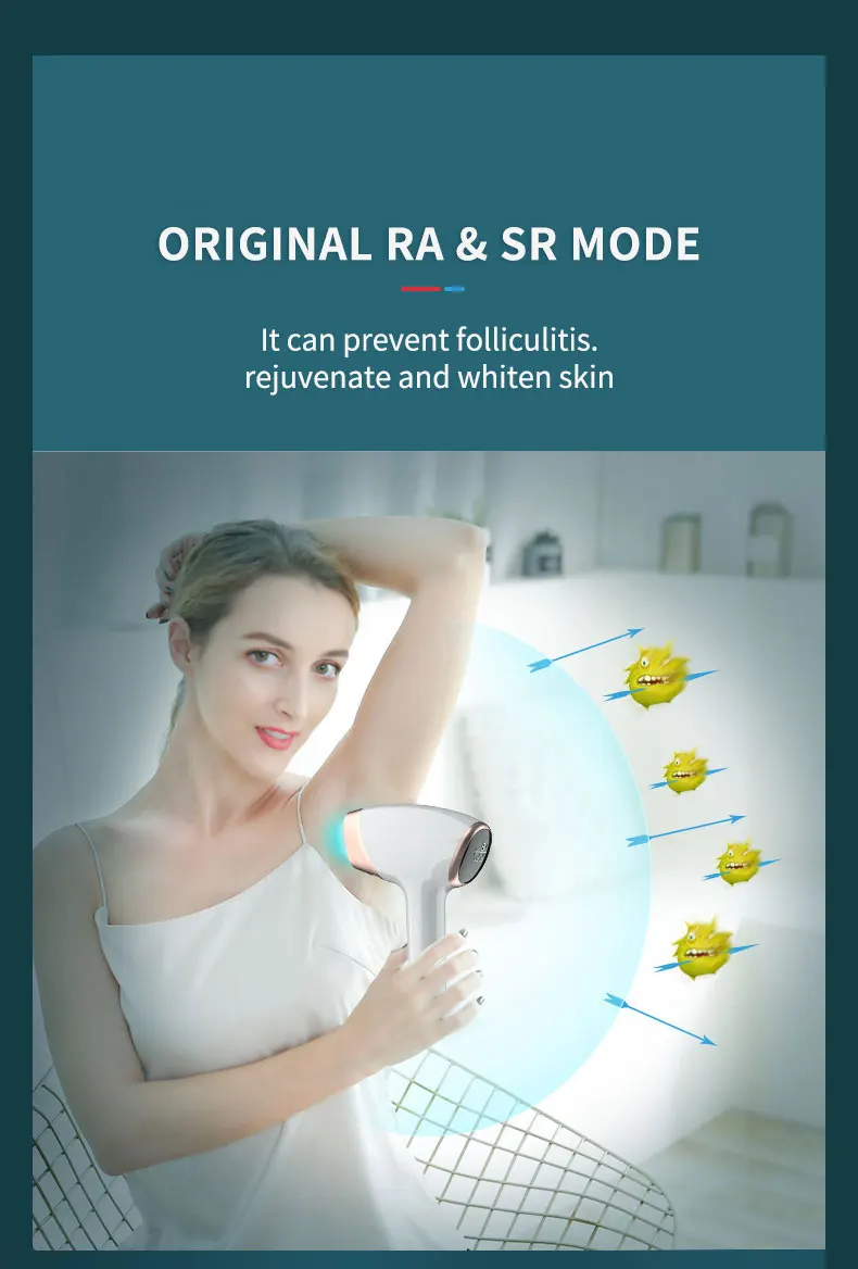 4. Два режима работы: ручная вспышка подходит для подмышек, бикини и другой небольшой области удаления волос. Автоматическая вспышка подходит для бедер, рук и других больших мест удаления волос. Длительное нажатие обеспечивает автоматический непрерывный свет, эффективность удаления волос увеличена на 30%.