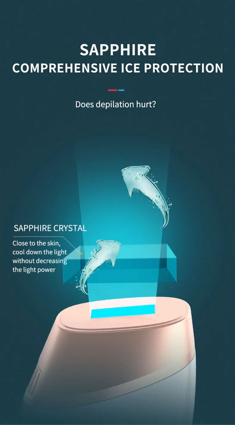 -Сапфировое стекло, используемое в лампе, охлаждает световую температуру, чтобы получить результат реального безболезненного удаления волос