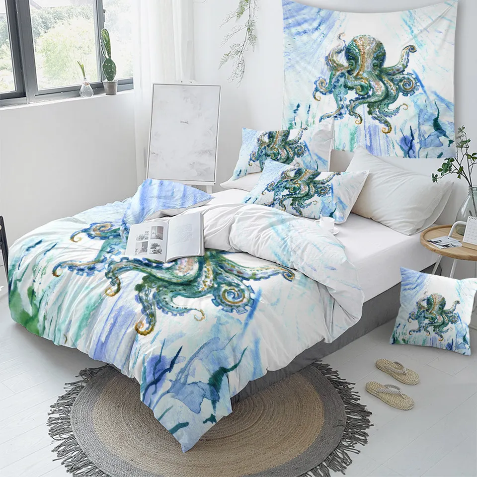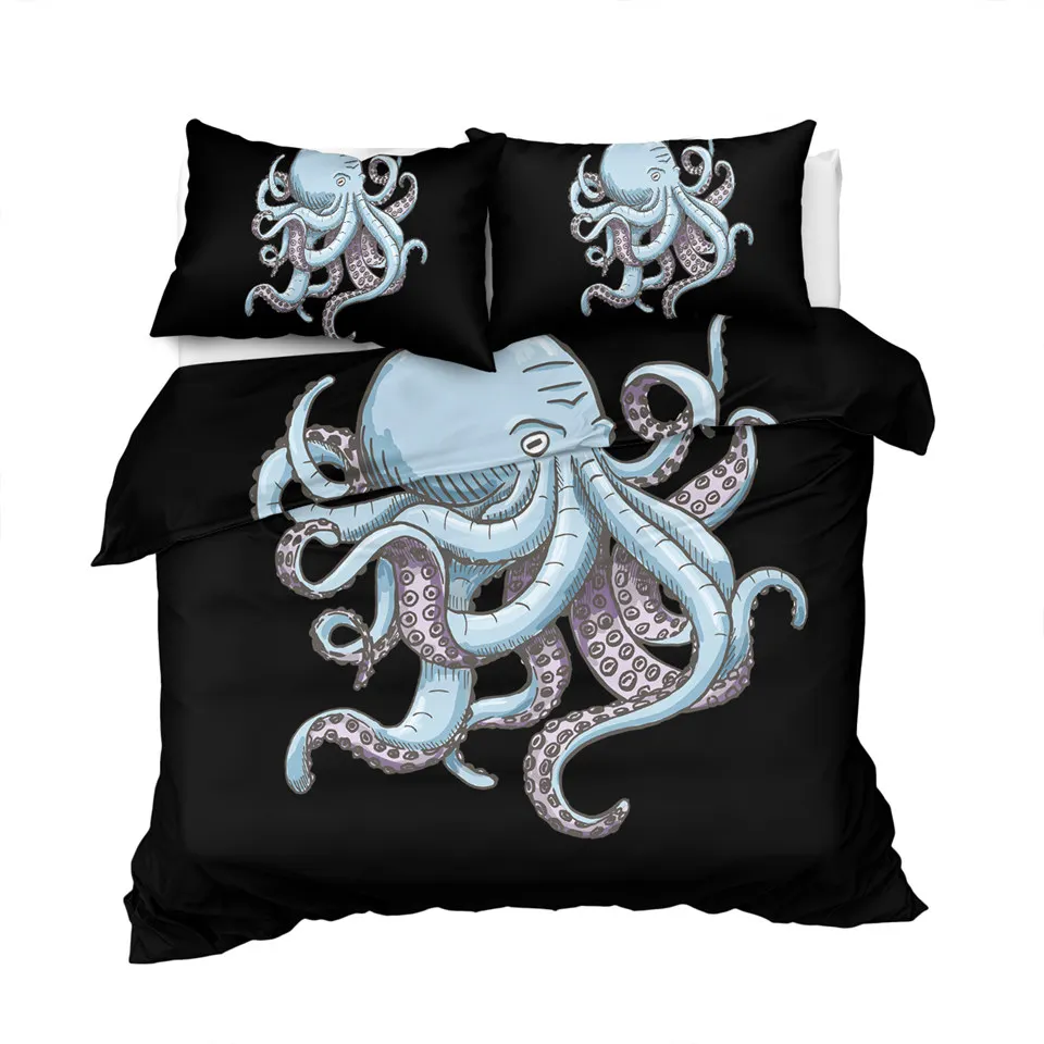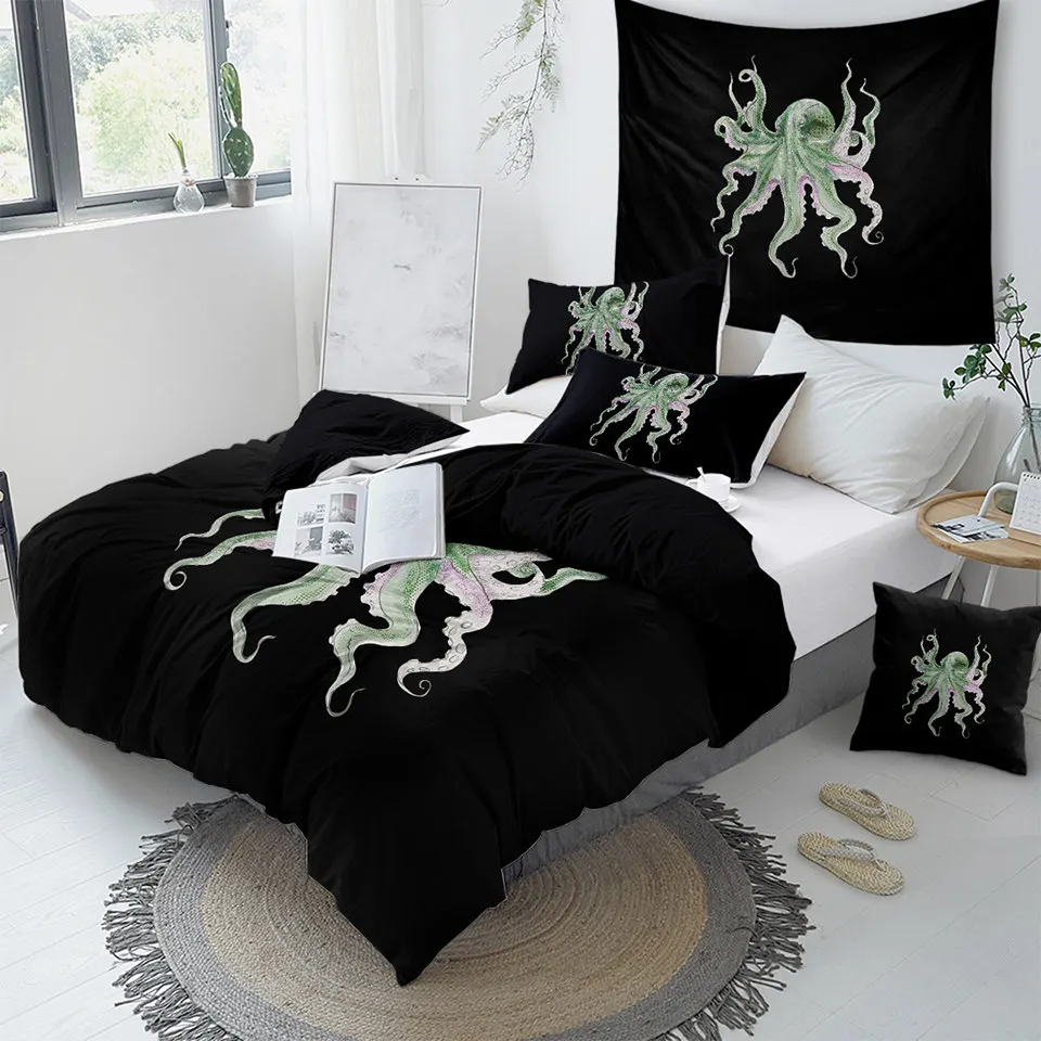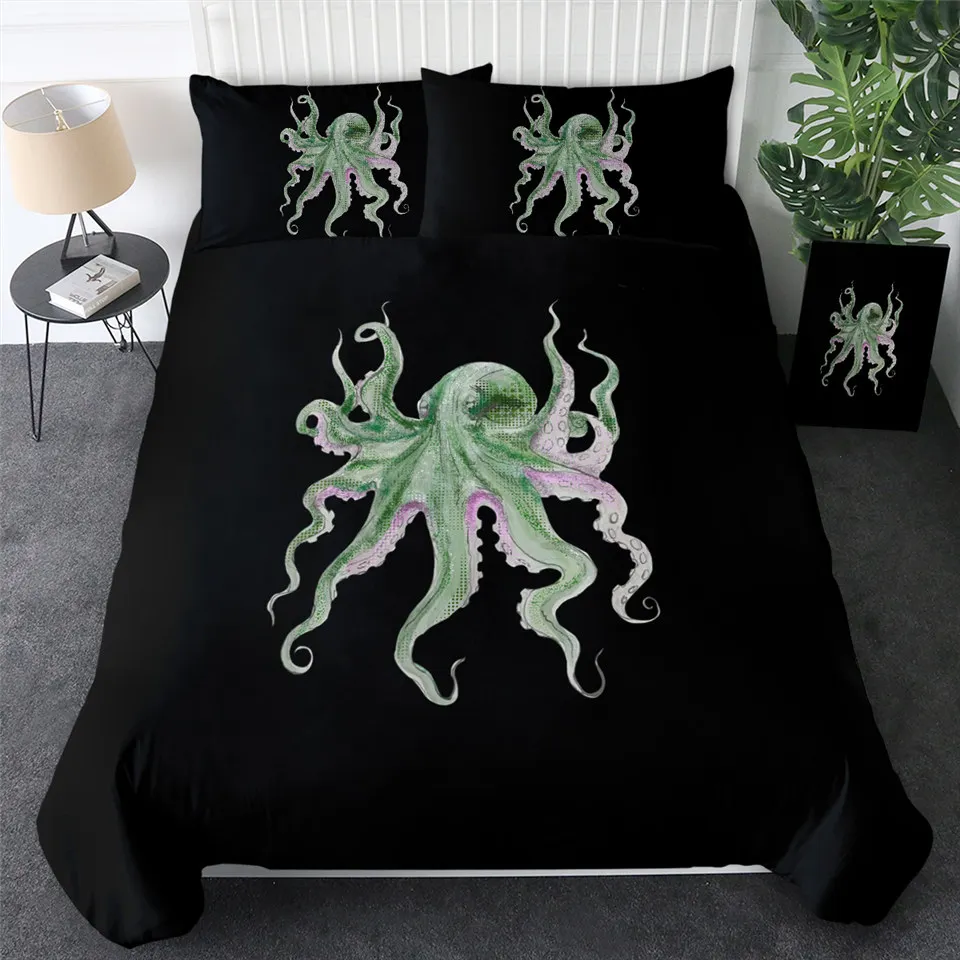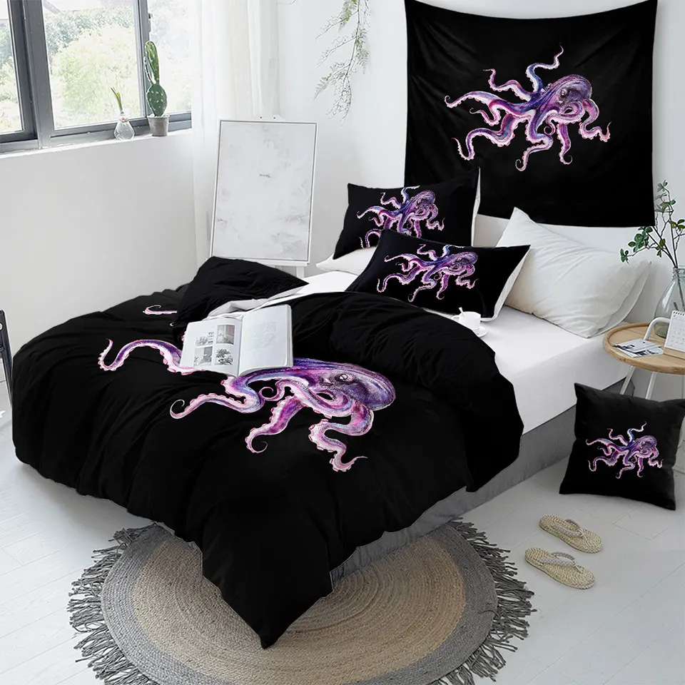 Item Name:Bedding SetPacking List:1* Duvet Cover + 2* Pillow CasesFabric:PolyesterSeason:Spring, Summer, Autumn, WinterFeatures:The ocean inspired curtain features a drawing of an octopus. It's especially suitable for those who love science fiction and fantasy creatures.BeddingOutlet Reminder:1) If you need extra sheet to match, please contact us.