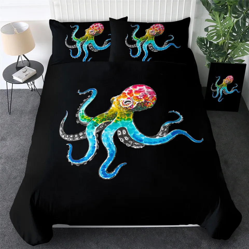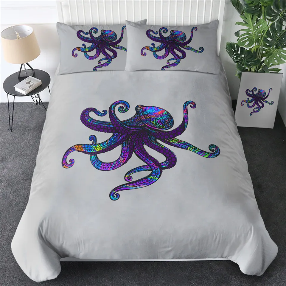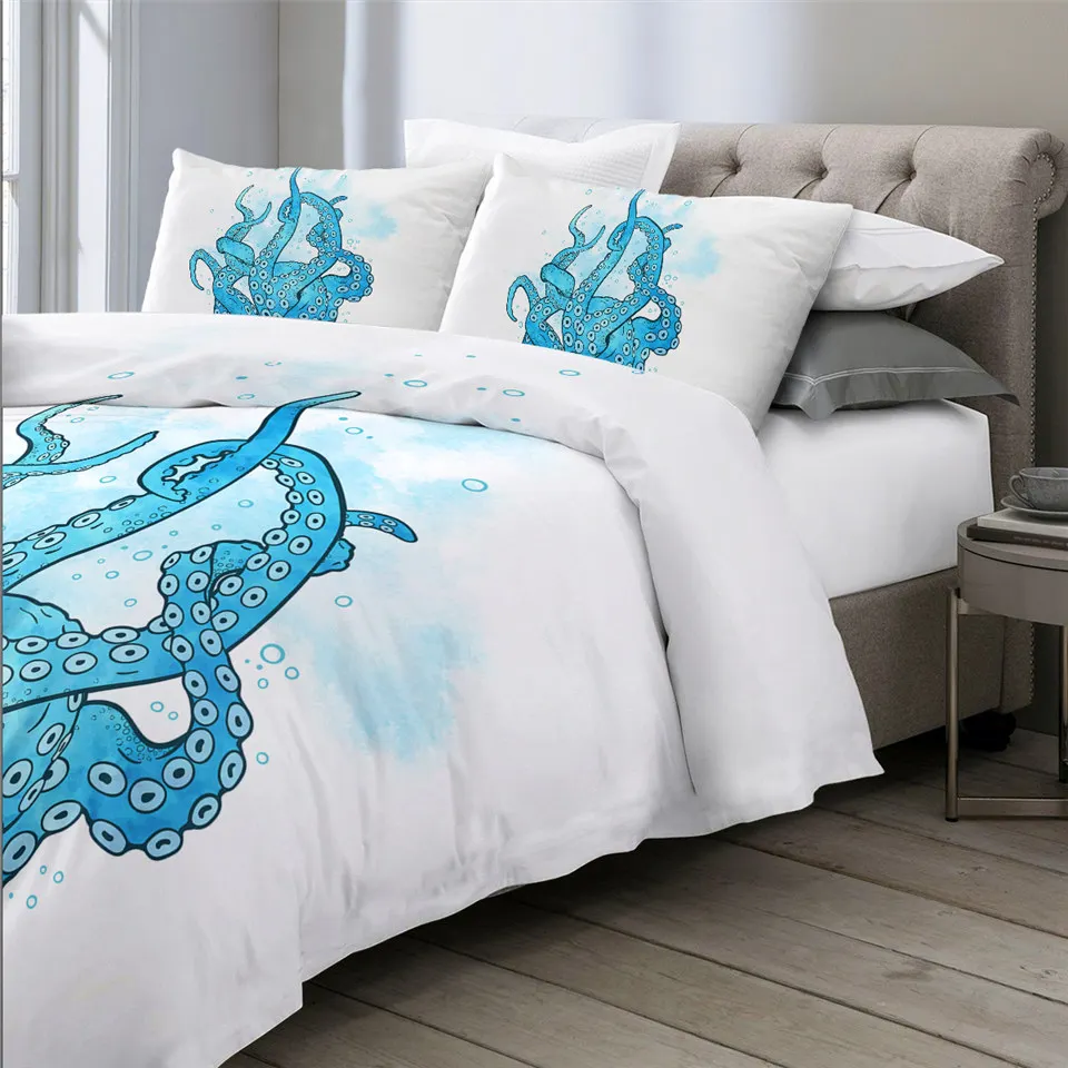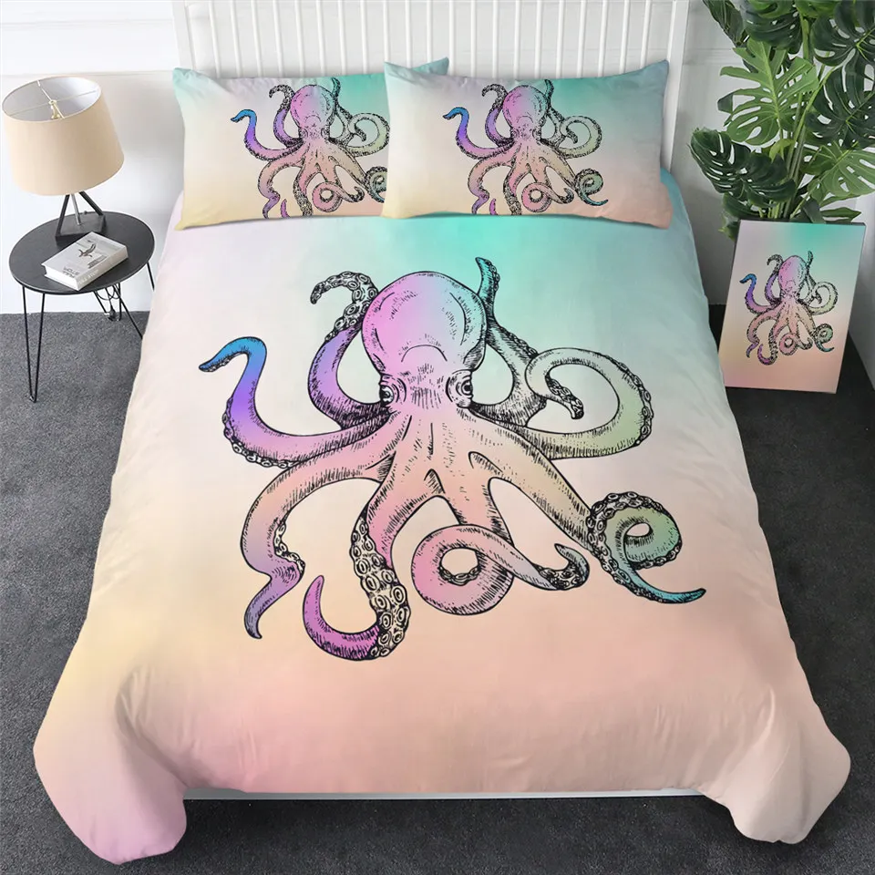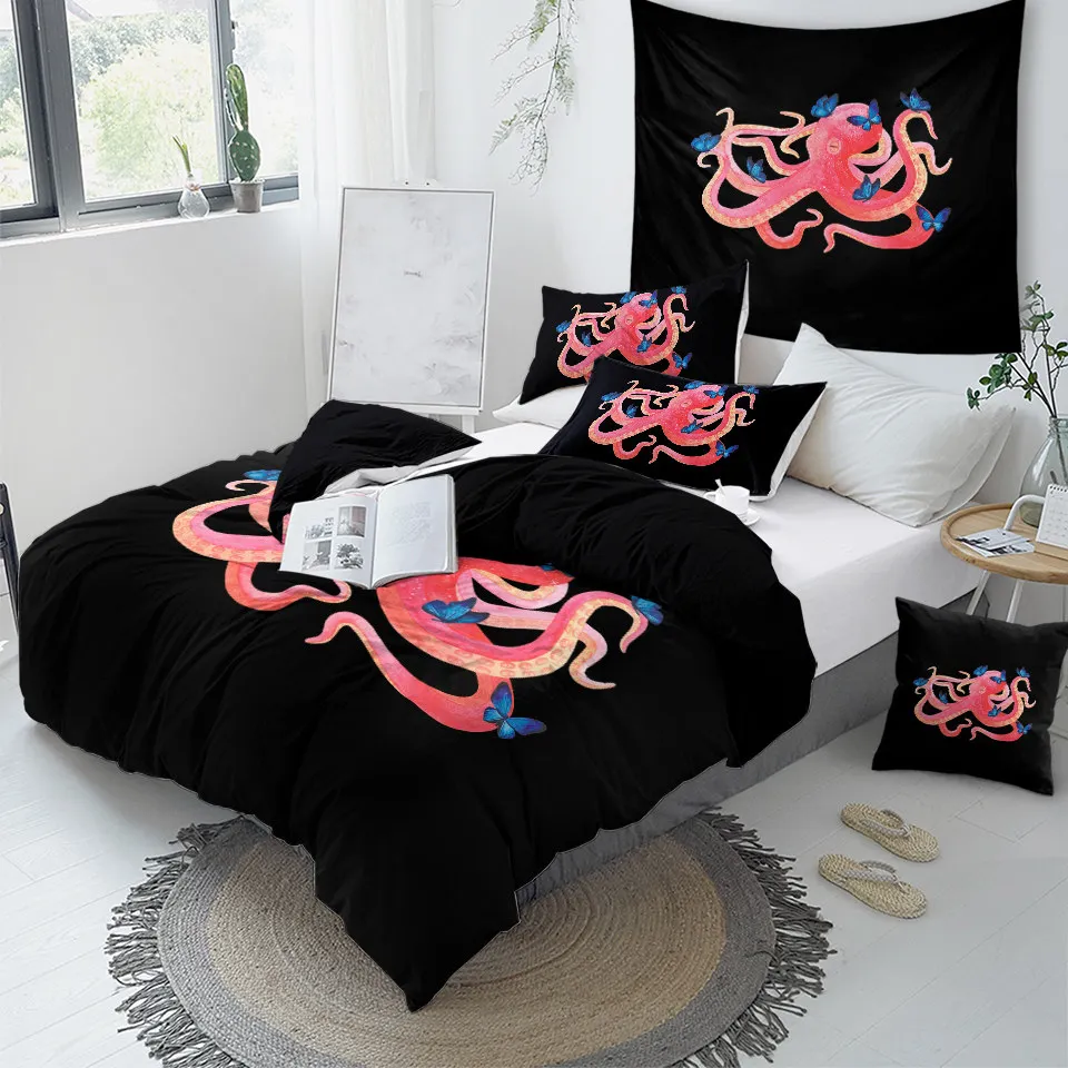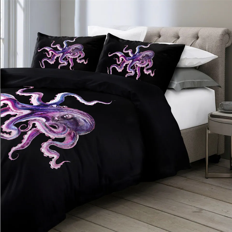 Item Name:Bedding SetPacking List:1* Duvet Cover + 2* Pillow CasesFabric:PolyesterSeason:Spring, Summer, Autumn, WinterFeatures:The ocean inspired curtain features a drawing of an octopus. It's especially suitable for those who love science fiction and fantasy creatures.BeddingOutlet Reminder:1) If you need extra sheet to match, please contact us.