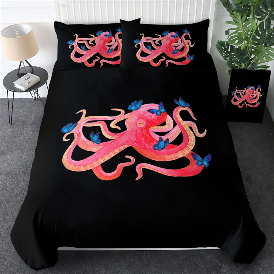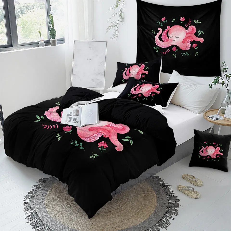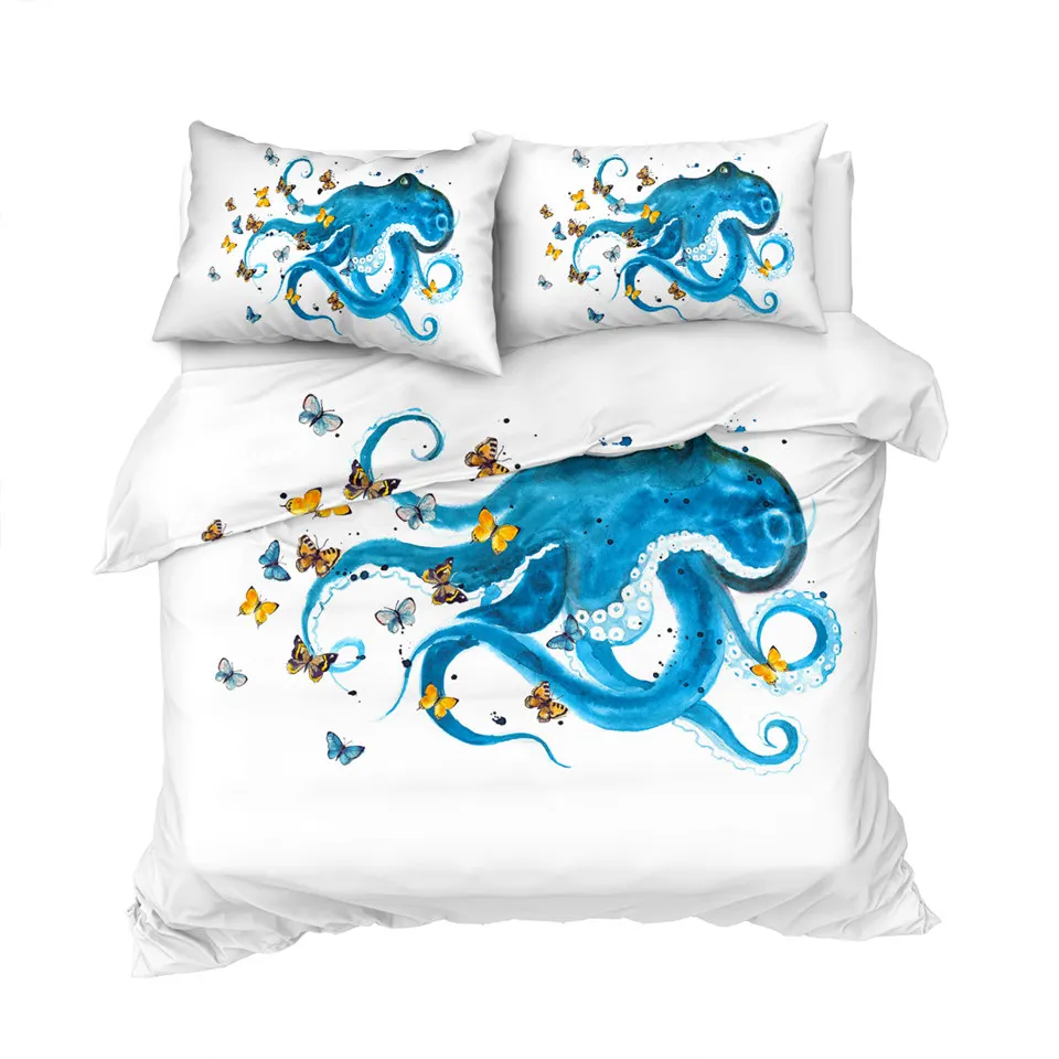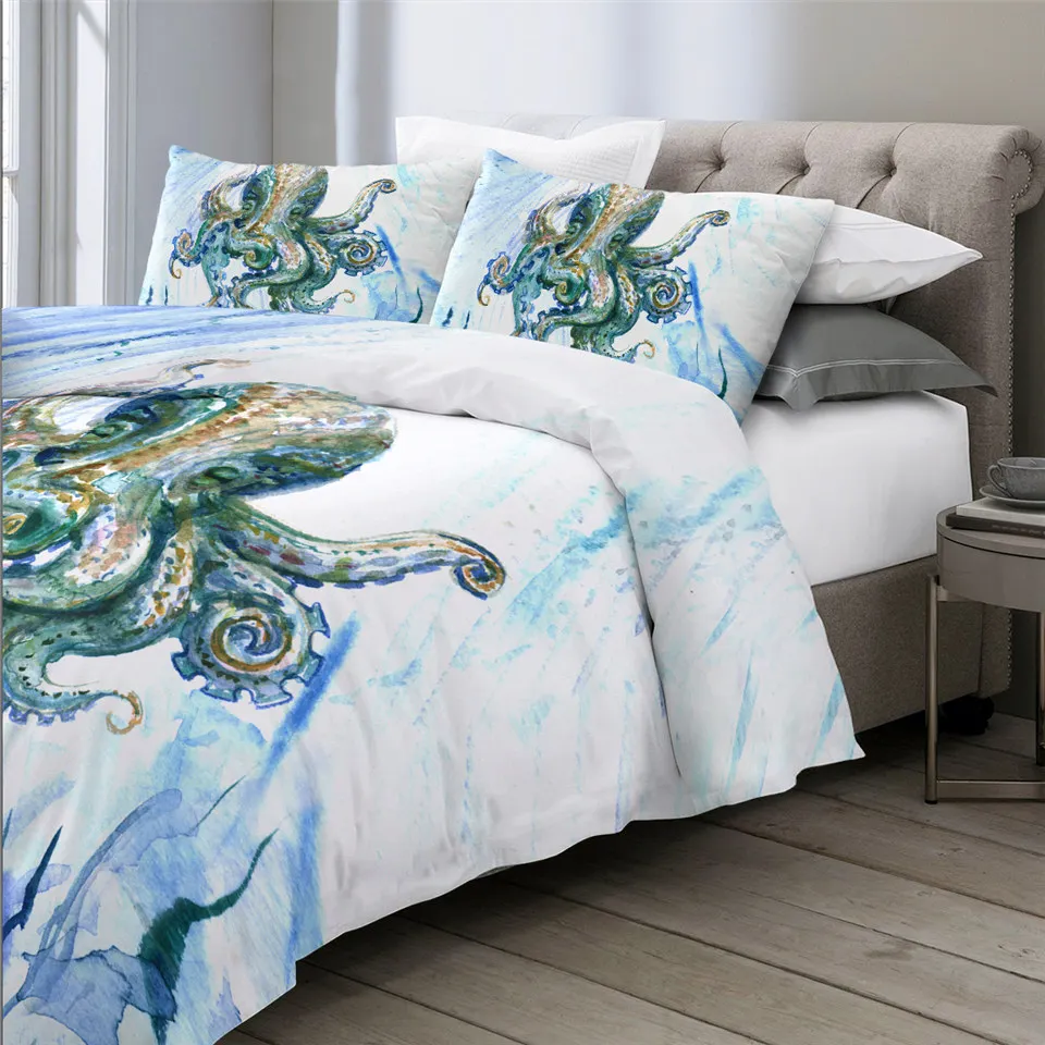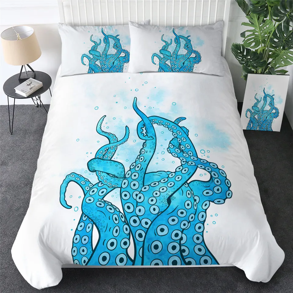 Item Name:Bedding SetPacking List:1* Duvet Cover + 2* Pillow CasesFabric:PolyesterSeason:Spring, Summer, Autumn, WinterFeatures:The ocean inspired curtain features a drawing of an octopus. It's especially suitable for those who love science fiction and fantasy creatures.BeddingOutlet Reminder:1) If you need extra sheet to match, please contact us.
