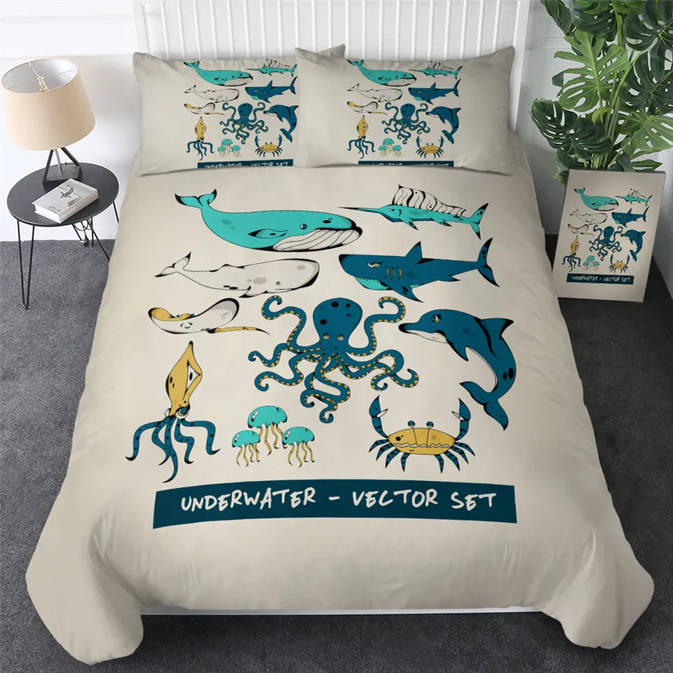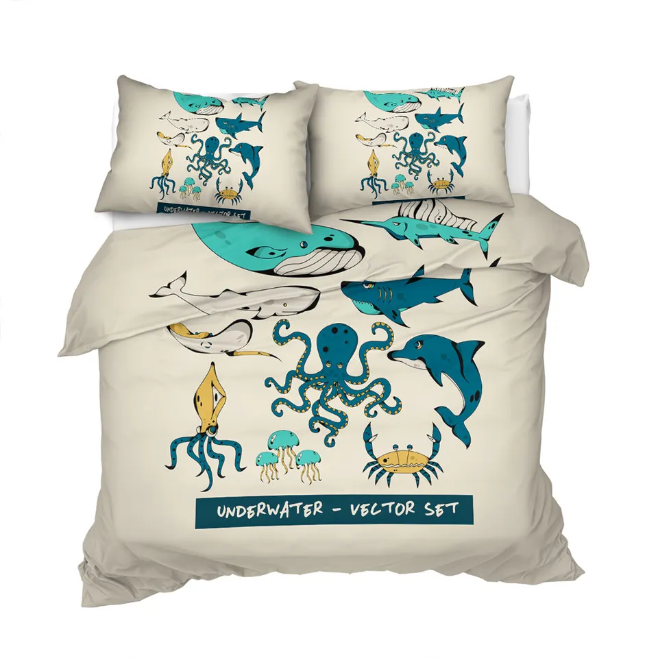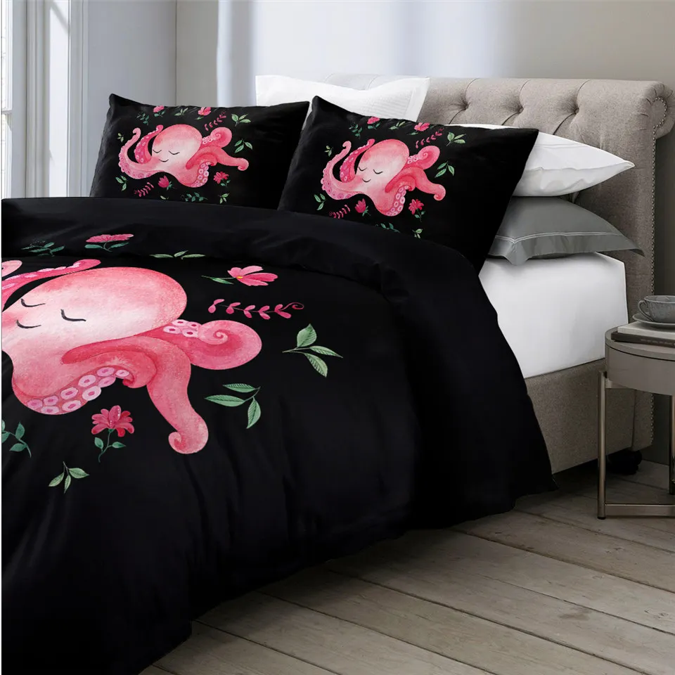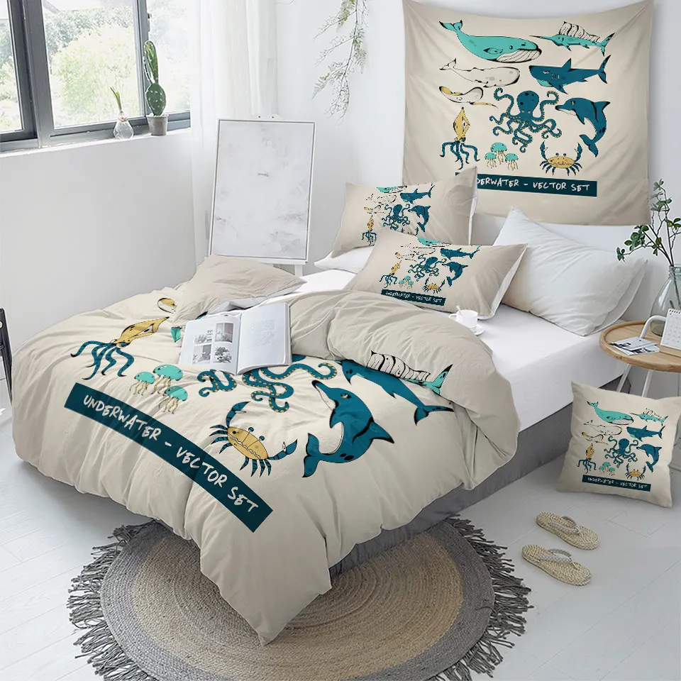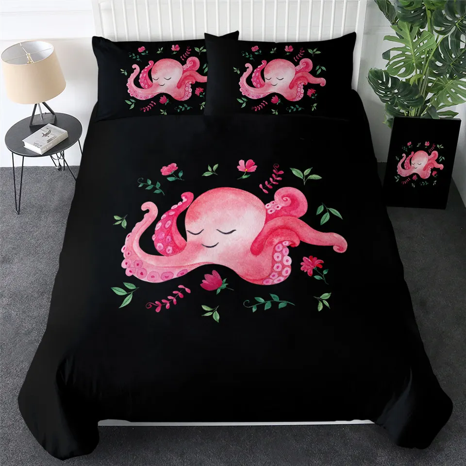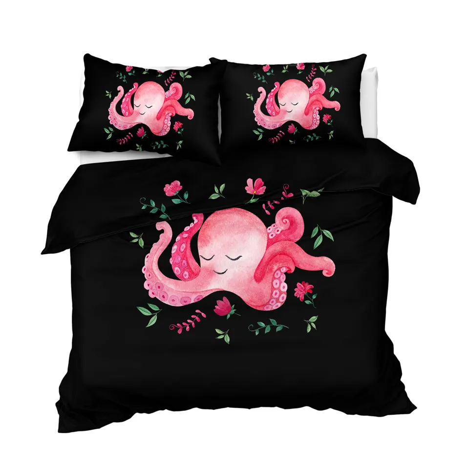 Item Name:Bedding SetPacking List:1* Duvet Cover + 2* Pillow CasesFabric:PolyesterSeason:Spring, Summer, Autumn, WinterFeatures:The ocean inspired curtain features a drawing of an octopus. It's especially suitable for those who love science fiction and fantasy creatures.BeddingOutlet Reminder:1) If you need extra sheet to match, please contact us.