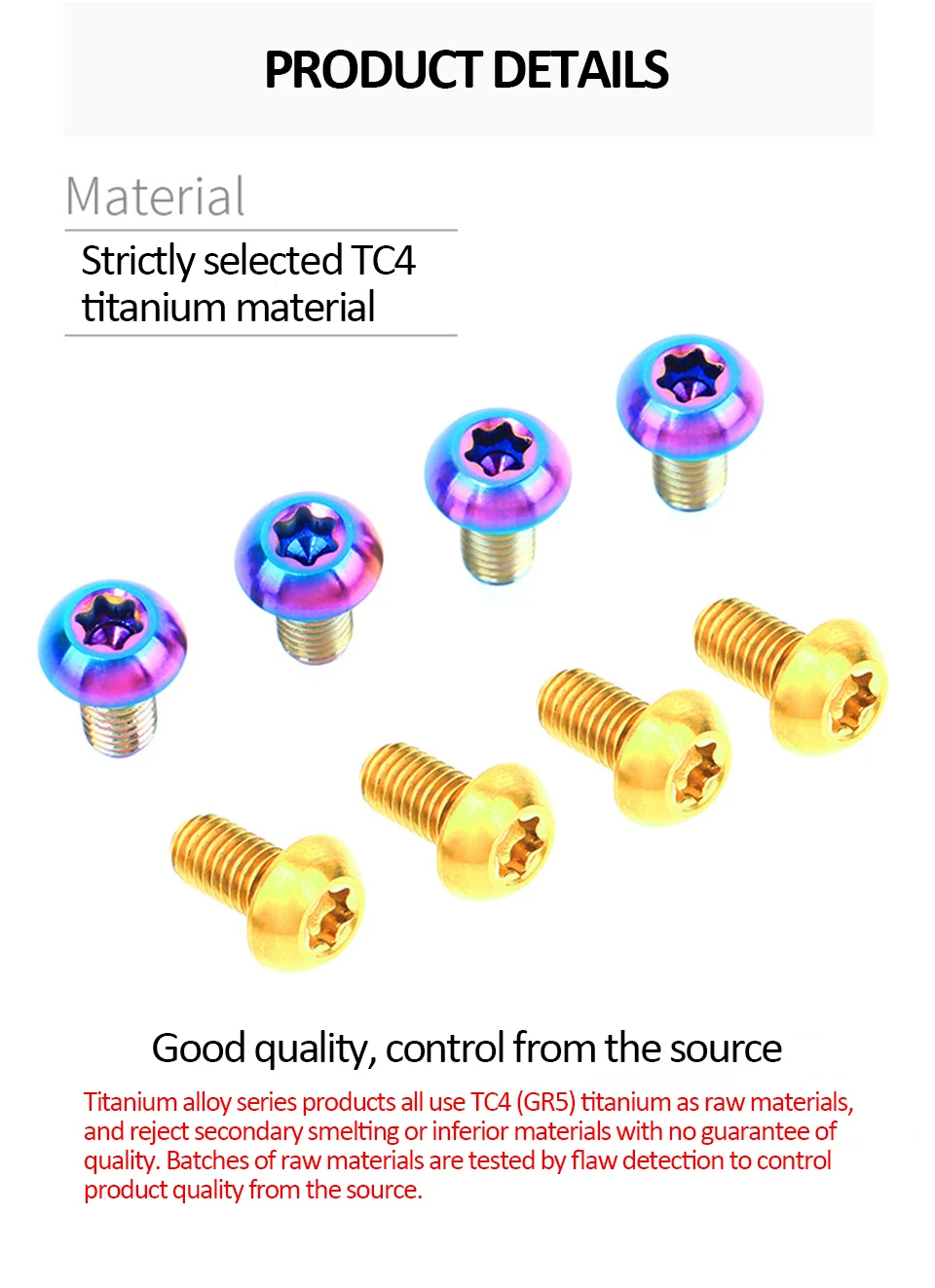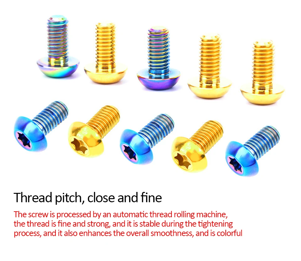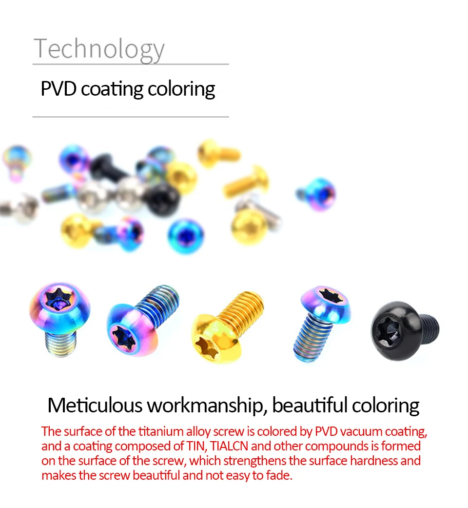 3. Поверхность винта из титанового сплава окрашена вакуумным покрытием PVD, а на поверхности винта образуется покрытие, состоящее из олова, тиалкна и других соединений, что усиливает твердость поверхности, А также делает винт красивым и не выцветающим.
