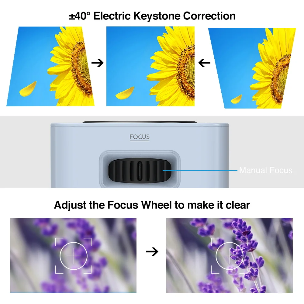 Он имеет диапазон электрической коррекции трапецевидного камня ± 40 °, вы можете увидеть изображение клеера. Вы можете повернуть колесо фокусировки, чтобы исправить его.