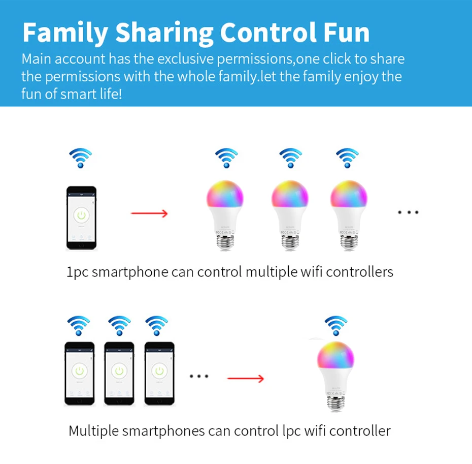 Купил более одной лампы? Вы можете создать группу для одновременного управления несколькими лампами из любой точки с стабильным Wi-Fi. Вы также можете поделиться своей учетной записью с друзьями и семьей для большего удовольствия. (Только в том случае, 2,4 ГГц поддерживается)