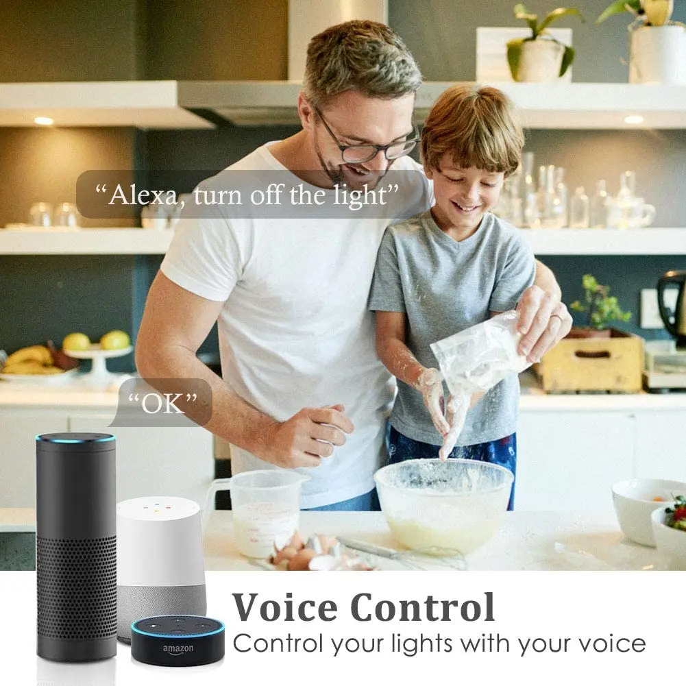 Работает с Alexa, Echo и Google Home. Используя голосовые команды, вы можете включить и выключить устройство из любой точки комнаты (например, вы готовите, лежа в кровати или держите много вещей в руке)