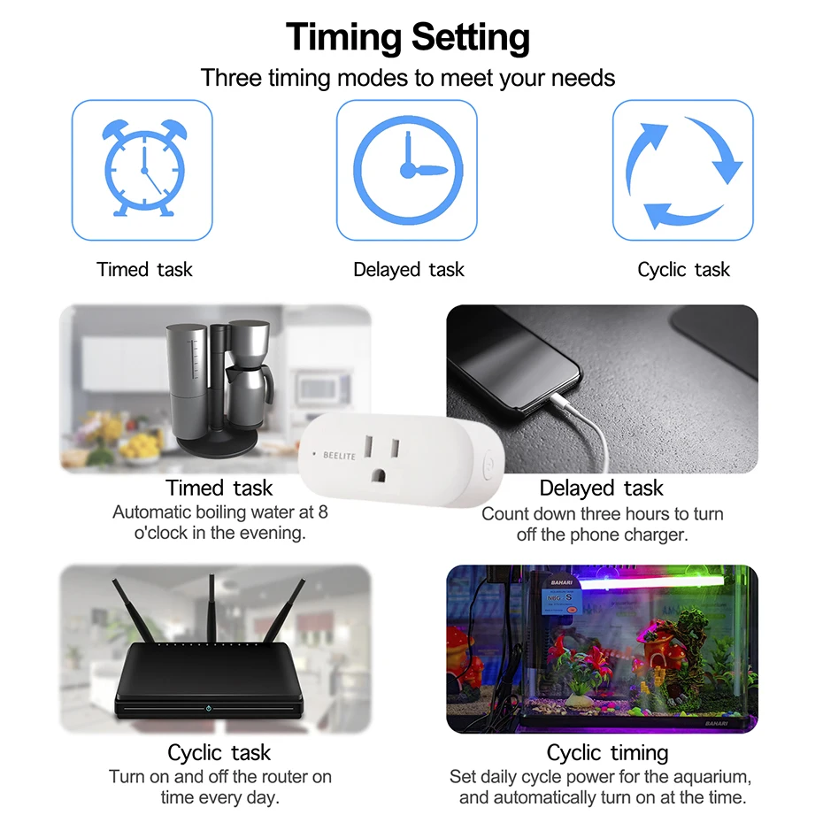Установите смарт-вилки, включайте или выключайте автоматически в определенное время. Вы можете подготовить ужин, прежде чем отправиться домой, или дистанционно управлять другими электрическими элементами, такими как лампы, электрические чайники, кофеварки, вентиляторы и т. д. Умная вилка Beelite поможет вам сэкономить на счете за электричество и продлить срок службы продукта