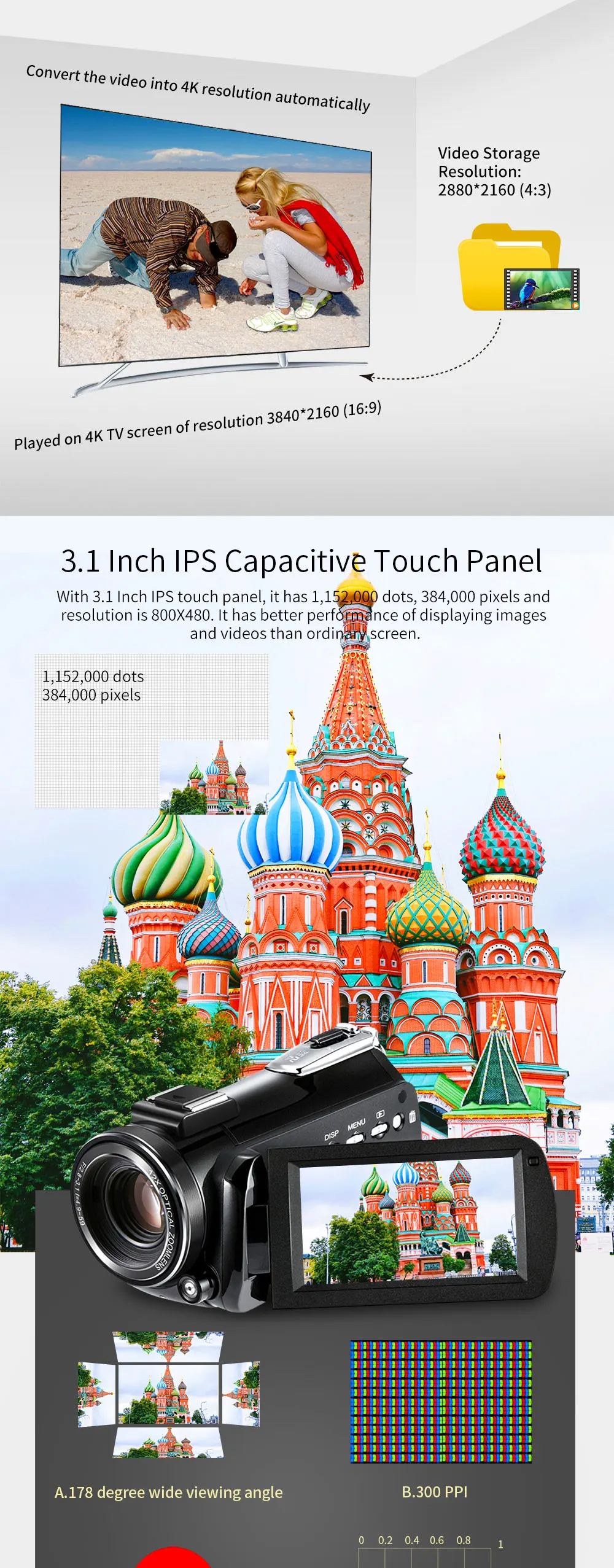 3,1 дюймов IPS сенсорный экран (16:9) разрешение:800*480