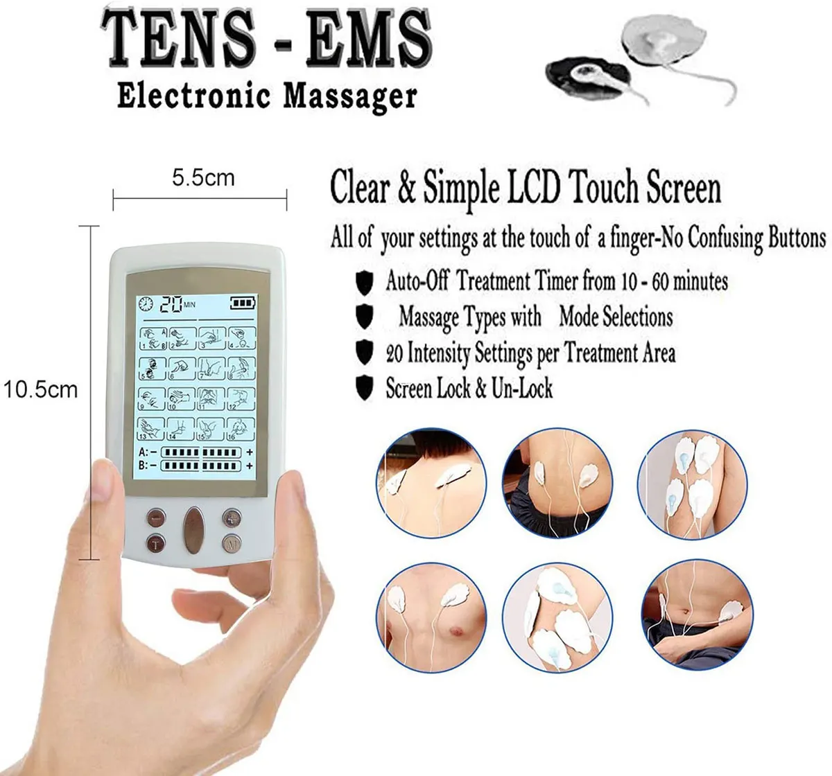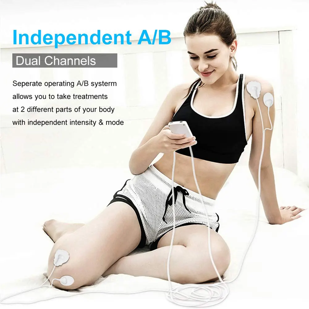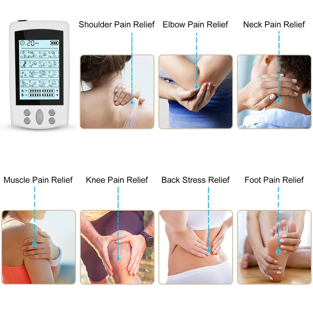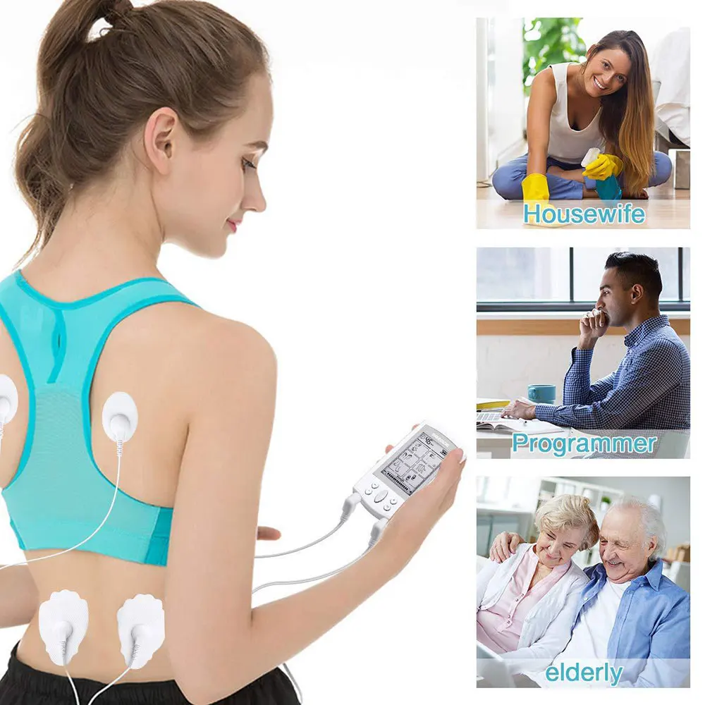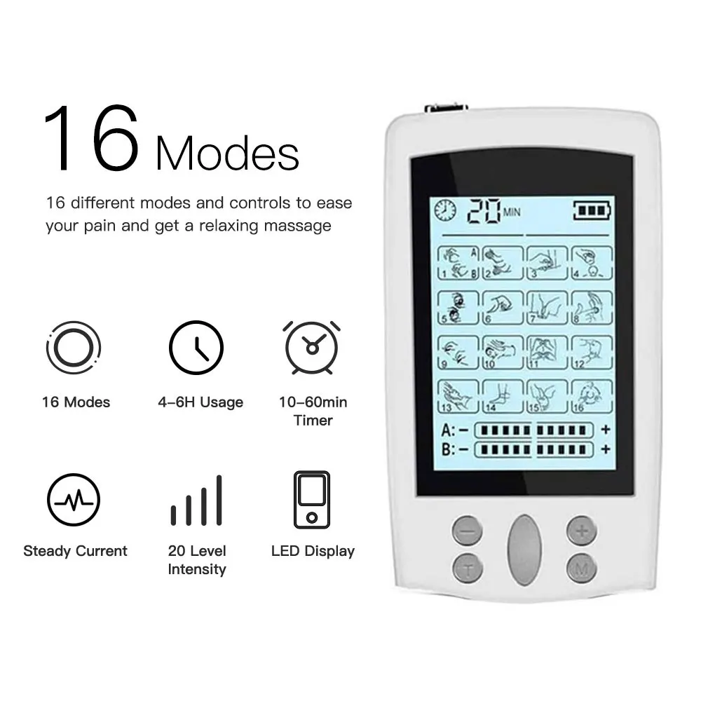 Specification: Type: Massager Modes: 16 Output: 2 Adapter :US/EU (110-240V) USB charger: 5V Power Supply: USB Port Item Size:9.5*1*5cm Item Weight:52g Package Size:14.5*8*7cm Feature: 16 Choices 16 stimulation modes, you can choose between a diverse range from knocking, kneading, shiatsu and more. 16 massage techniques help to relieve pain, including shoulder, waist, back, buttocks, etc. (Pressing the "M" button to change the mode). Adjustable Schedule Timer& Intensity Create a scheduled timer from 10-60min by pressing the "T" button. And, the unit will automatically shut-off when the time is up. Also, there are 10 intensity levels, easy to adjust by pressing the "+/-" button to increase or decrease the intensity. 2 Outputs 2 outputs are isolated and has the same power, allow 2 sets of pads to be applied to the different areas at the same time. Also, you can share with your friends or family members to have a fantastic massage experiences together. Portable Compact size(9.5x5.0cm)and lightweight (only 52g) design, easy to carry, you can use it conveniently anywhere and anytime. Easy-to-view LCD Display: The LCD display with backlight provides better viewing at day or night. And, the battery indicator will flash when it need to recharge battery. Usage: 1. Connect the pads to the wire by snapping them on, then remove the protective film. 2. Place pads where the massage sensations are desired. And plug into one of the ports on the devices.You can plug two wires at the same time. Each wire can connect with two pads. One pad is the anode, the other is the cathode. So if you only plug one wire, you should MAKE SURE THAT TWO PADS CONNECTED WITH THE WIRE ARE PLACED ON YOUR SKIN TOGETHER so that the unit can work properly. 3.Turn the device on by sliding the on/off switch on the top of the unit. The unit will be activated. 4.Press the mode button to try different mode. 5.Once you selected a mode, gradually increase the intensity by pressing the "+' button, decrease the "-" button.(Note: Press central button to change different channels) Note: 1.Do not use if you have following medical conditions: 2. Acute disease, trauma or surgical procedure in past 6 months 3. Cardiac Dysfunction 4. Epilepsy 5. High Blood Pressure 6. High Fever 7. Infectious Disease 8. Malignant Tumors 9. Recent Surgery 10. Skin Problems 11. Pregnancy 12. Undiagnosed Pain Syndromes 13. Abdominal or Inguinal Hernia 14. Painful and/ or Atrophied Muscles 15.Limited Range of Motion in Skeletal Joints 16 . Please refer to the user manual to get more information before using. 16 Modes: 1. Lateral Palm Kneading Massage 2. Flat Palm Kneading Massage 3. Crosscut Fist Kneading Massage 4. Vertical Fist Kneading Massage 5. Acupuncture 6. Moxibustion 7. Acupuncture Kneading Massage 8. Rubbing Reduction 9. Shiatsu 10. Fibrillation Massage 11. Lifting-pinching Manipulation 12. Vibrating Manipulation 13. Foot Reflexology 14. Footplate Massage 15. Ear Press-Kneading 16. Ear Lifting-pinching Manipulation Package List: 1 * Tens Control Unit Device 2 * Extra large 2 * Large Pad 2 * Small Pad 2 * Electric Wire 1 * USB Cable & Adapter 1 * Acupuncture Point Chart 1 * English Instruction Manual
