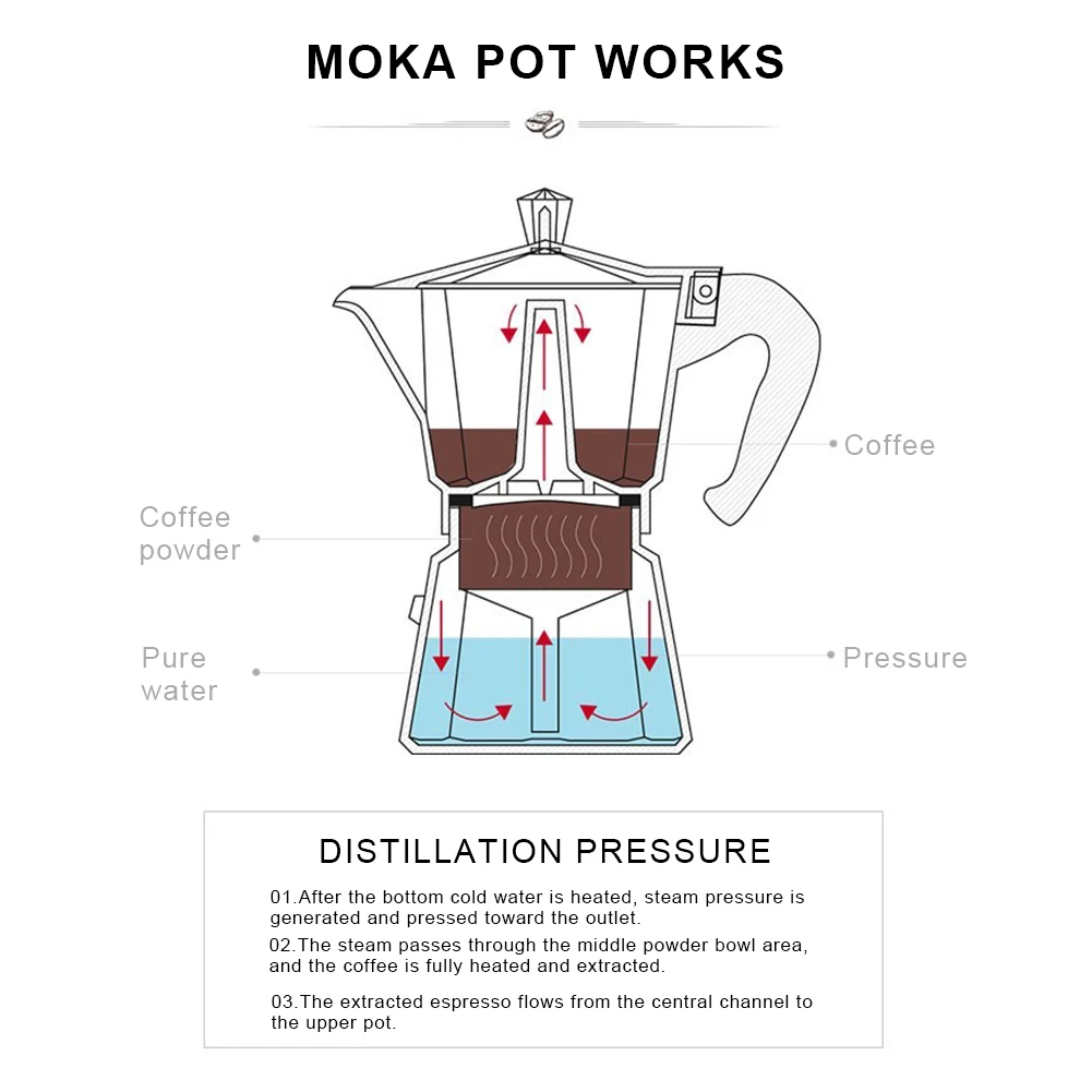 * 1. Кофейник мокко изготовлен из алюминиевого материала, устойчив к высокой температуре и падению, легко моется