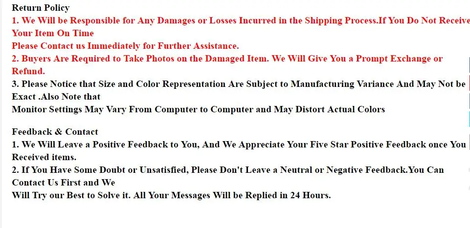 Часто задаваемые вопросы и отзывы: В: Оптовая и Прямая поставка приветствуются? О: для оптовой продажи мы предлагаем скидку или бесплатную Экспресс-доставку, которая занимает всего 3-7 дней. Для дропшиппинг, мы могли бы отправить товары непосредственно вашим клиентам и не оставить информацию о нас, если вы хотите. В: Как я могу отследить свою посылку? О: Вы можете отследить свою посылку на следующем веб-сайте с помощью вашего номера отслеживания: //global.cainiao.com/ Www.17track.net Чтобы открыть скопируйте в строку браузера 【 1. Поскольку ваши отзывы очень важны для развития нашего бизнеса, мы искренне приглашаем вас оставить положительные отзывы (пять звезд) для нас, если вы удовлетворены нашим продуктом и обслуживанием. 【 2. Пожалуйста, свяжитесь с нами, прежде чем оставить отрицательный или нейтральный отзывы. Мы будем работать с вами, чтобы решить любые проблемы. Спасибо! Наилучшие пожелания!