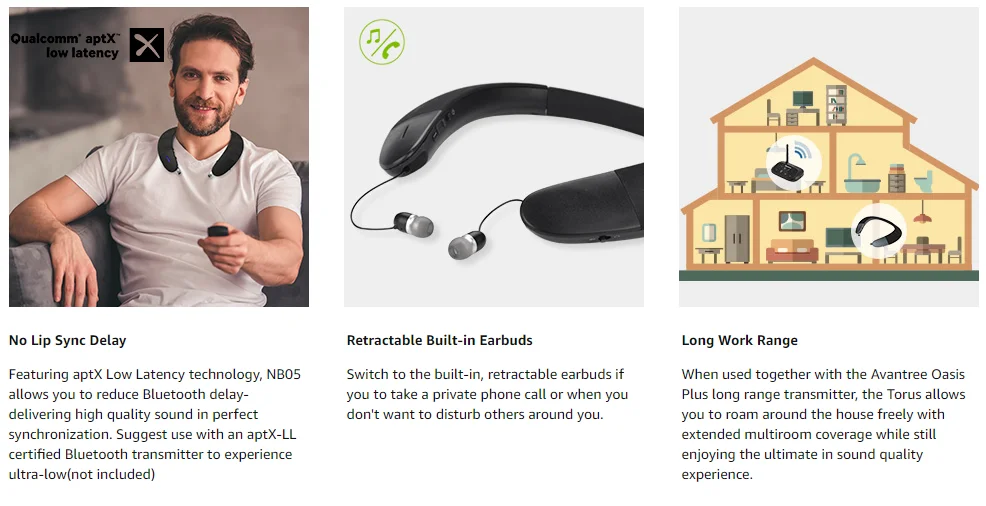 [Высокое качество 3D звука] испытайте Полнодиапазонный динамик с обеих сторон шеи динамик, окружающий ваши уши, чтобы произвести 3D театральное качество звука. Благодаря кодеку с низкой задержкой aptX устраняет задержку синхронизации губ для просмотра ТВ/фильмов при использовании с aptX-LL сертифицированным Bluetooth передатчиком, таким как Avantree Oasis Plus.