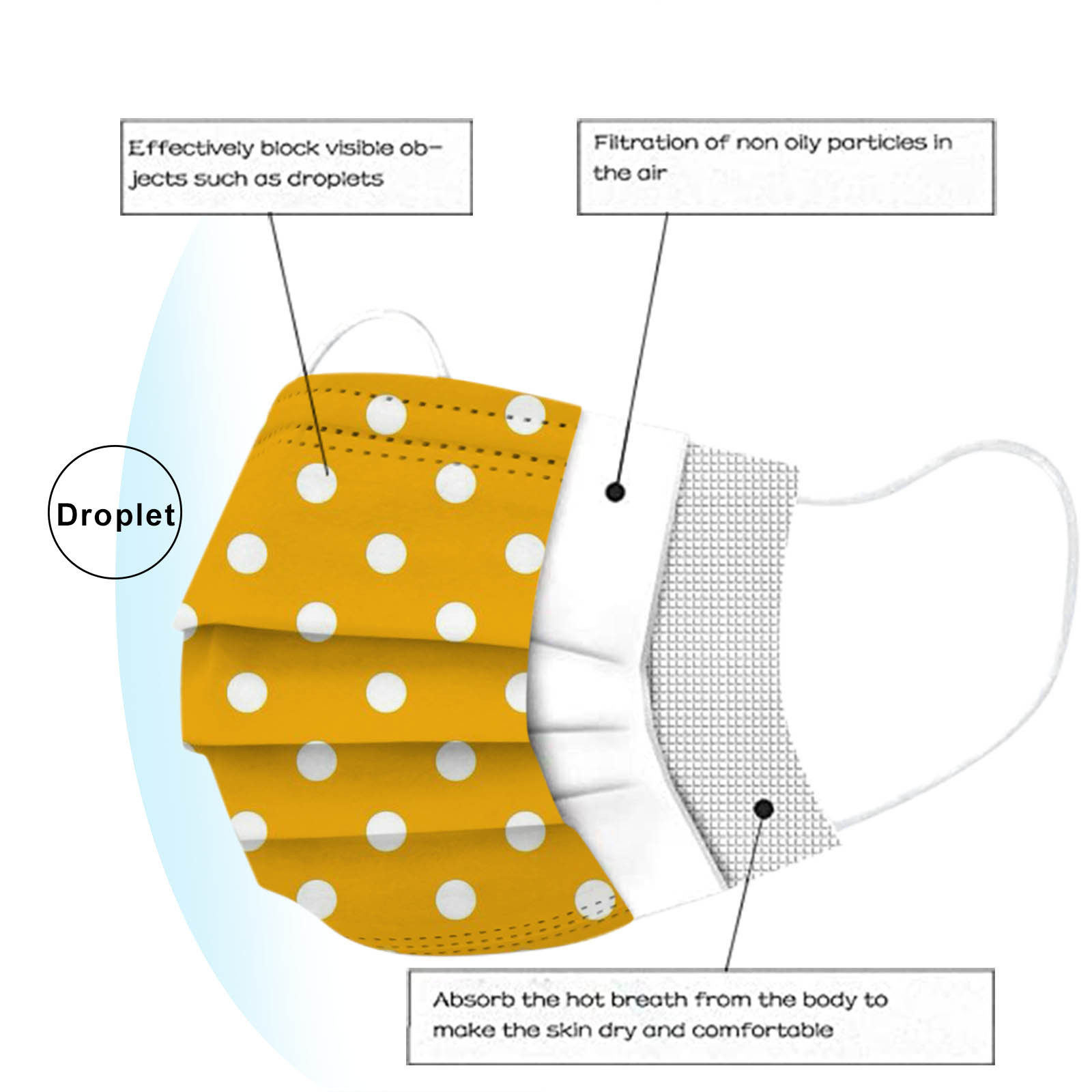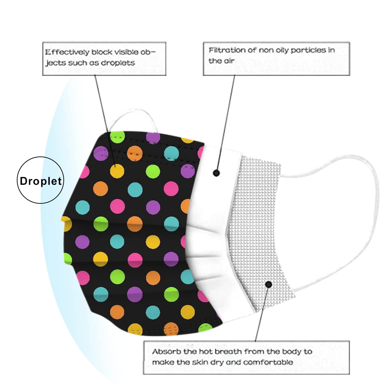 В 3 слояТкань из спанлейсаОдноразовая маска изготовлена из 3 слоевТкань из спанлейсаМатериал, он Безопасен и безопасен для использования. Дышащий материал и милый Узоры, которые делают его полезным и модным. Специальный 3 слоя из нетканого материала Дизайн, обеспечивает некоторую защиту от пыли, автомобильных выхлопных газов, Пыльца и т. д. эластичная Ушная петля, легко носить и не давит на уши. Маникюрный салон или любые другие области, где может потребоваться защита