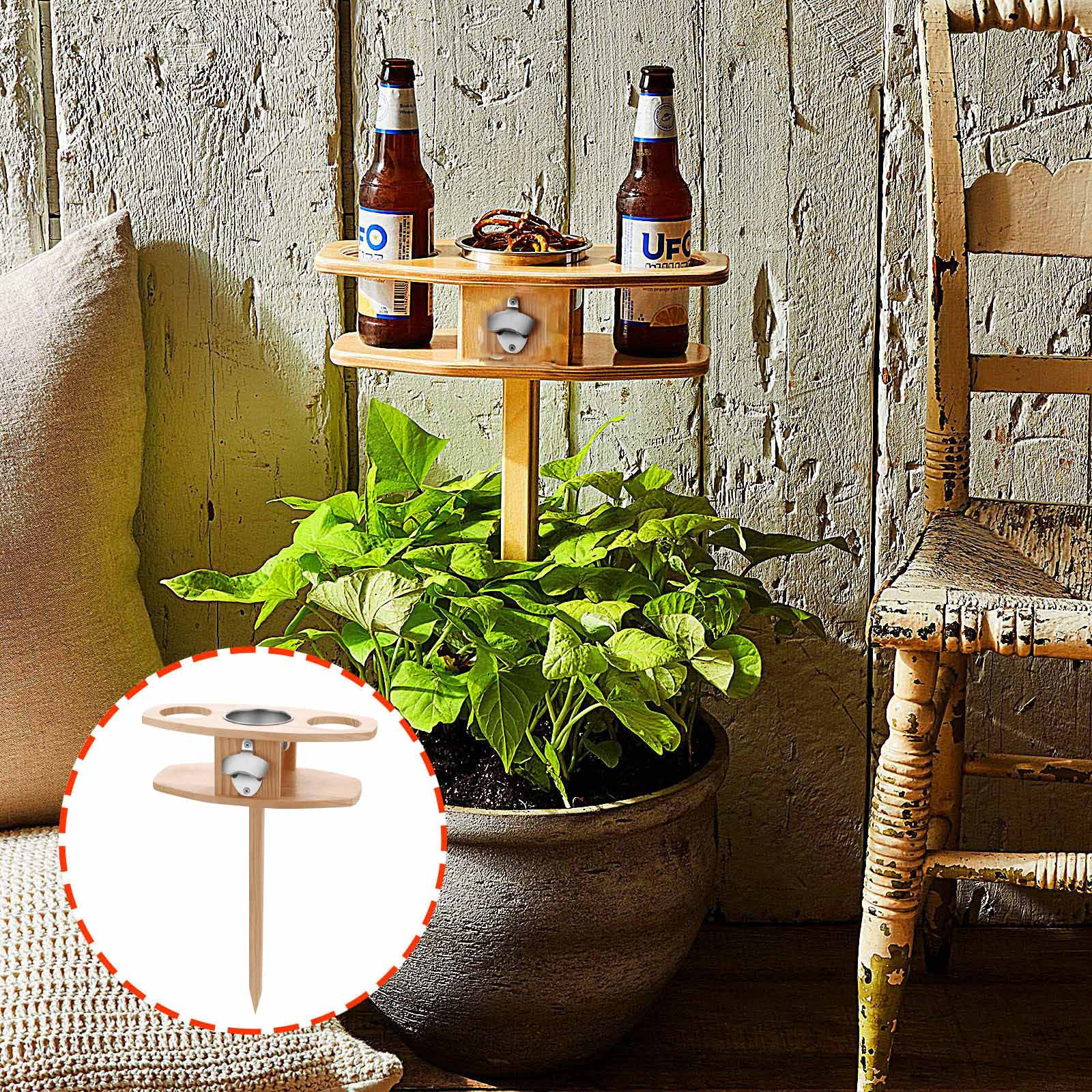 1. Этот складной стол для вина ручной работы является обязательным для всех любителей вина. 2. Он предназначен для хранения всех элементов классической бутылки вина для пикника, двух очков и тарелки ваших любимых винных салонов. 3. Идеально подходит для фестивалей вина на открытом воздухе, семейных пикников, кемпинга, пляжа или просто спокойного вечера на вашем заднем дворе! 4. Деревянный стол складывается плоско и замки в обоих положениях, открываются и закрываются. 5. Стержень из стекловолокна толкает в землю с небольшим усилием. Работает в траве, грязи и песке.Посылка в комплекте