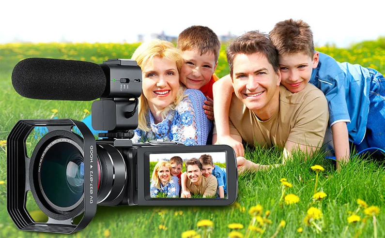 Видеокамера с внешним микрофоном и широкоугольным объективом: