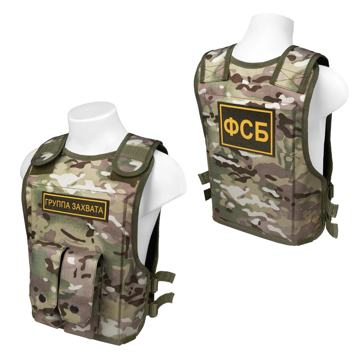 В комплекте: бронежилет с имитаторами бронепластин, подсумками, нашивкой и шевроном, спецназовская маска «труба», тактическая бейсболка. При помощи плечевых пат и боковых стяжных ремней, бронежилет легко