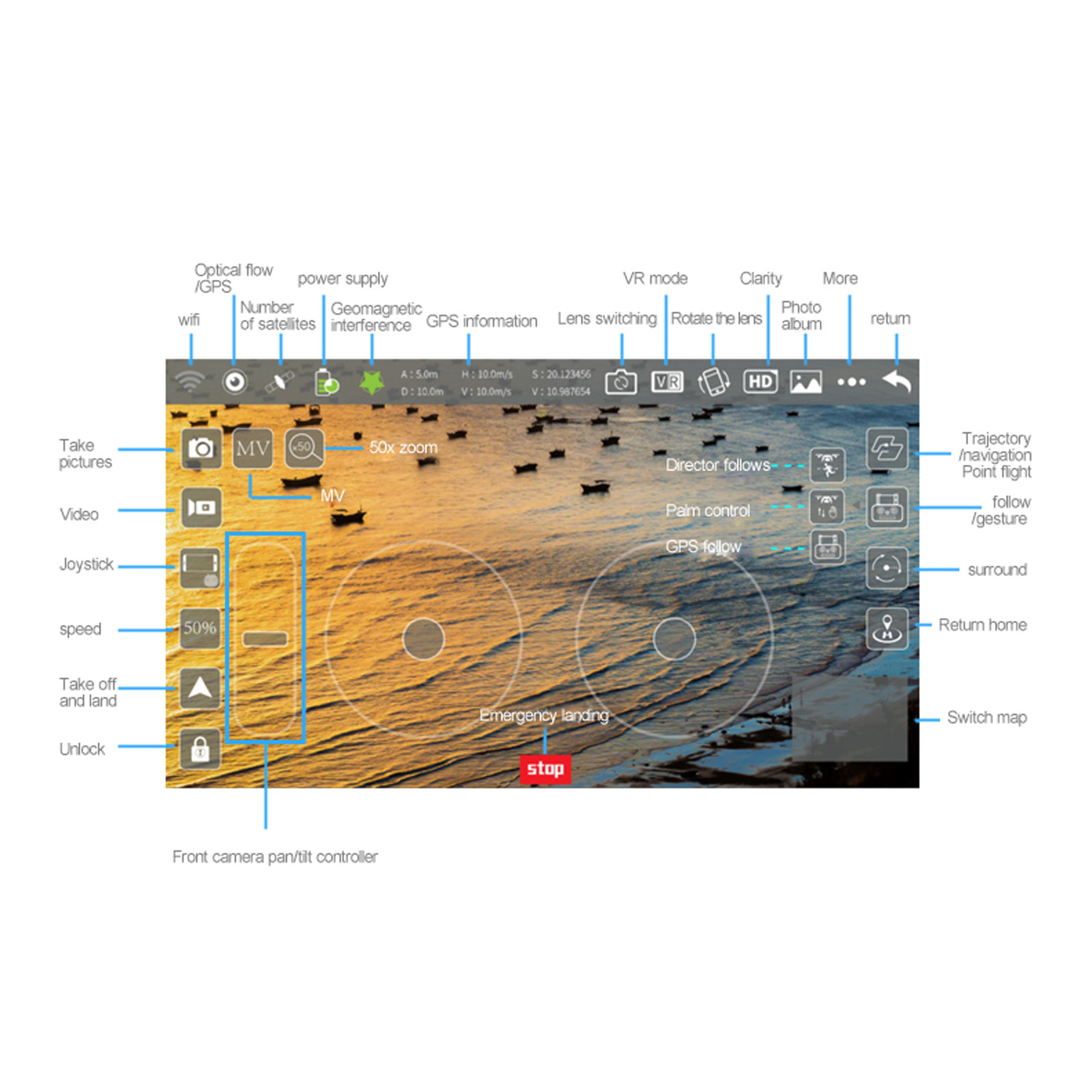 4K Камера ESC HD: угол камеры можно регулировать удаленно через Пульт дистанционного управления. GPS один ключ для возврата Точка снятия, возврат домой с низкой мощностью, возврат домой без Сигнал. ① интеллектуальное отслеживание GPS; ②Изображение: распознавание gps-сигнала Автоматически Следуйте за полетом. Бесщеточный двигатель: он может обеспечить сильную мощность, позволяя дрону летать Плавно на ветру. Распознавание Жестов: в пределах 1-3 м от самолета, лицом к лицу Камера, чтобы сделать фото жестом/жестом камеры. Многоточечное планирование маршрута полета: самолет будет летать автономно Согласно установленному маршруту, и игрок будет делать снимки. Орбита с фиксированной точкой: Найдите центр орбиты, а затем используйте Джойстик для перемещения желаемого радиуса орбиты. Функция поиска самолета: нажмите на значок gps-сигнала 3 раза подряд, чтобы Откройте интерфейс карты. На карте отображается расстояние, широта и Долгота самолета. Обмен фотографиями и видео: вы можете поделиться фотографиями одним или несколькими Выбор, и видео можно делиться только индивидуально.Характеристики: