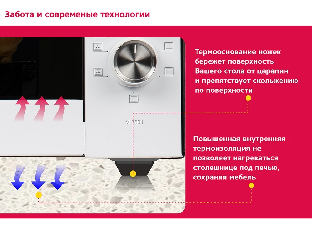 Верхний нагрев можно выбирать для обжаривания сверху уже почти готовых блюд. Нижний нагрев рекомендуется для длительного приготовления больших блюд. Использование обоих режимов - традиционный метод нагрева, благодаря которому происходит равномерный нагрев по всему объему камеры, а значит идеальная прожарка блюд.