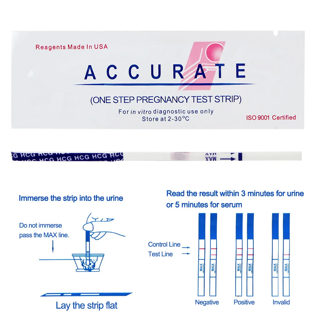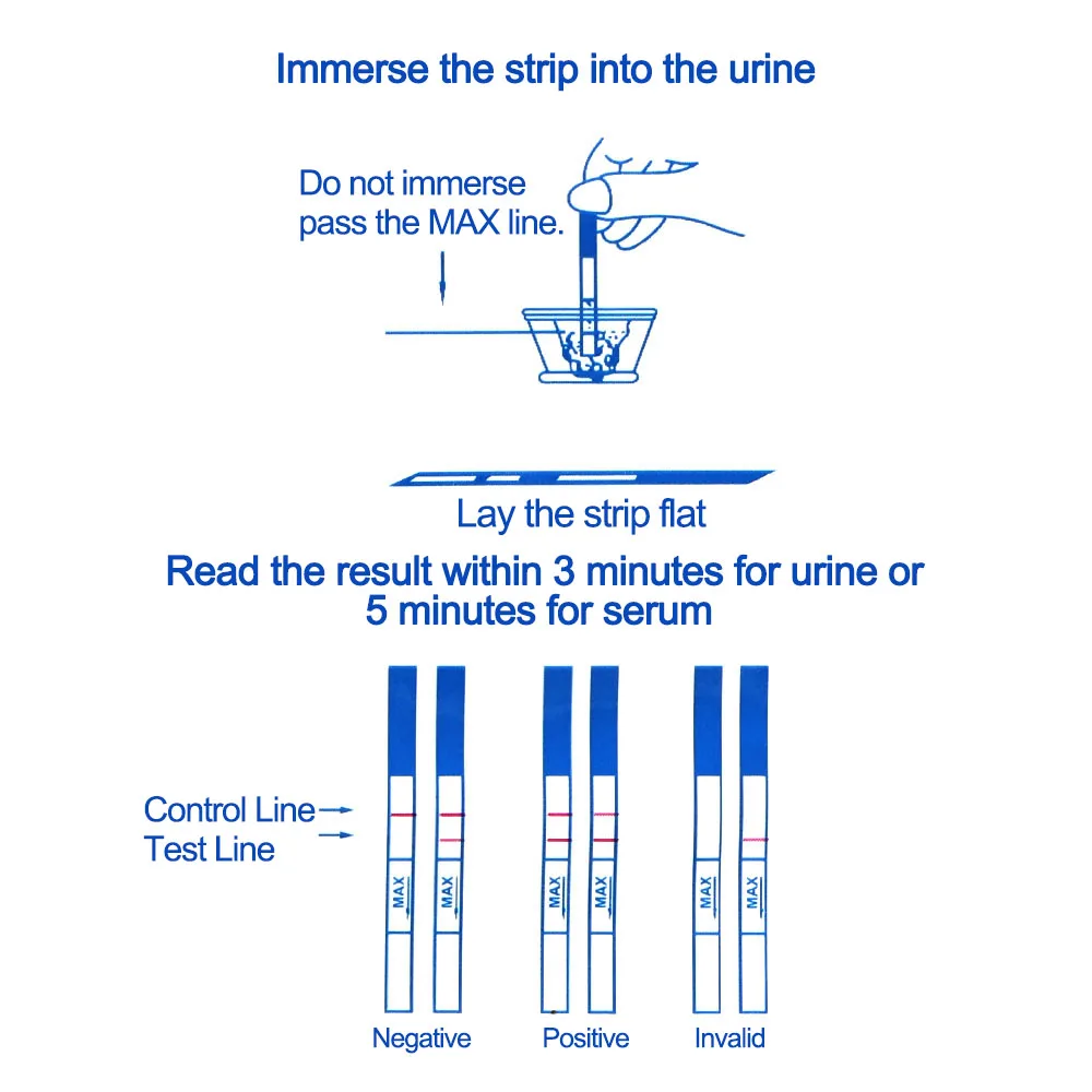 Тест на беременность ХГЧ-полоски быстрый, качественный тест для определения хорионического гонадотропина человека в образцах мочи человека, чтобы помочь в обнаружении беременности. Интерпретация результатов тестирования: Положительная (две линии), отрицательная (одна линия), недействительная (без линий или без контрольной линии).