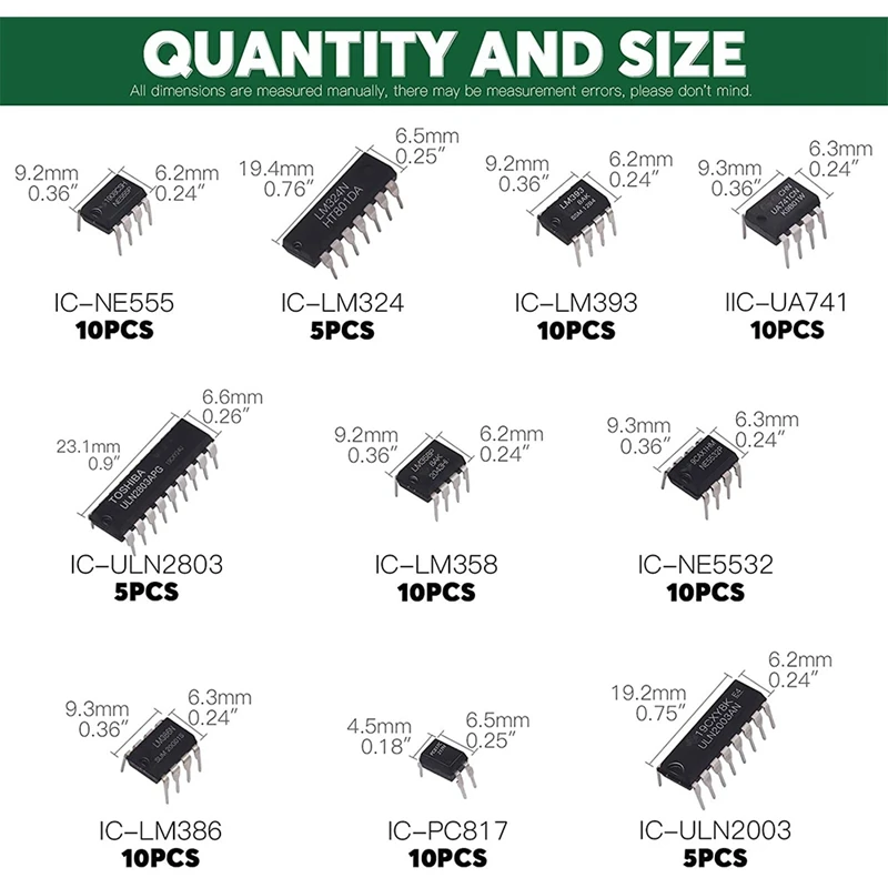 Полный 10 типов s: есть 85 шт. 10 значений интегральных микросхем на выбор, в том числе NE555 LM324 LM393 UA741 ULN2803 LM358 LM386 NE5532 ULN2003 PC817 DIP IC разъемы припоя Тип адаптера.