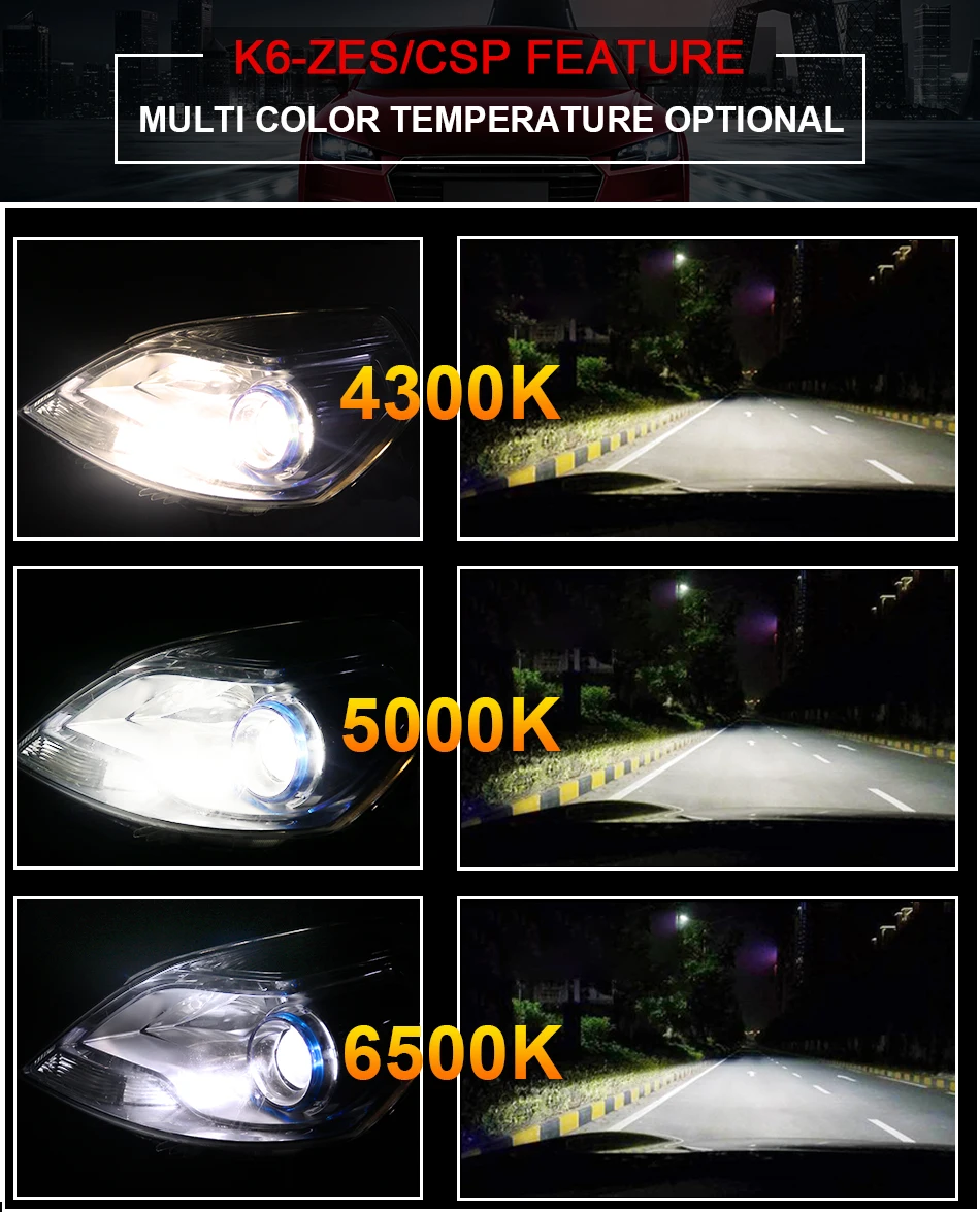 Серия K6 с чипами ZES Напряжение: 9-32 В постоянного тока Световой поток: фара: 20000lm/комплект Цветовая температура: 6500K белый, 5000K теплый белый, 4300K белый желтый Срок службы: >50000 часов
