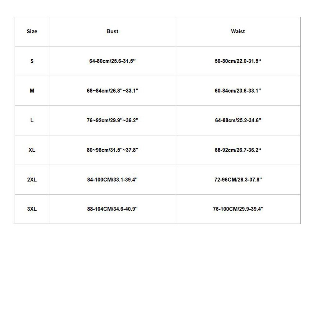 Размер Бюст Талия S 64-80 см/25,6-31,5 дюйма 56-80 см/22,0-31,5 дюйма М 68 ~ 84 см/26,8 "~ 33,1" 60-84 см/23,6-33,1 дюйма L 76 ~ 92 см/29,9 "~ 36,2" 64-88 см/25,2-34,6" XL 80 ~ 96 см/31,5 "~ 37,8" 68-92 см/26,7-36,2 дюйма 2XL 84-100 см/33,1-39,4" 72-96 см/28,3-37,8" 3XL 88-104 см/34,6-40,9" 76-100 см/29,9-39,4"